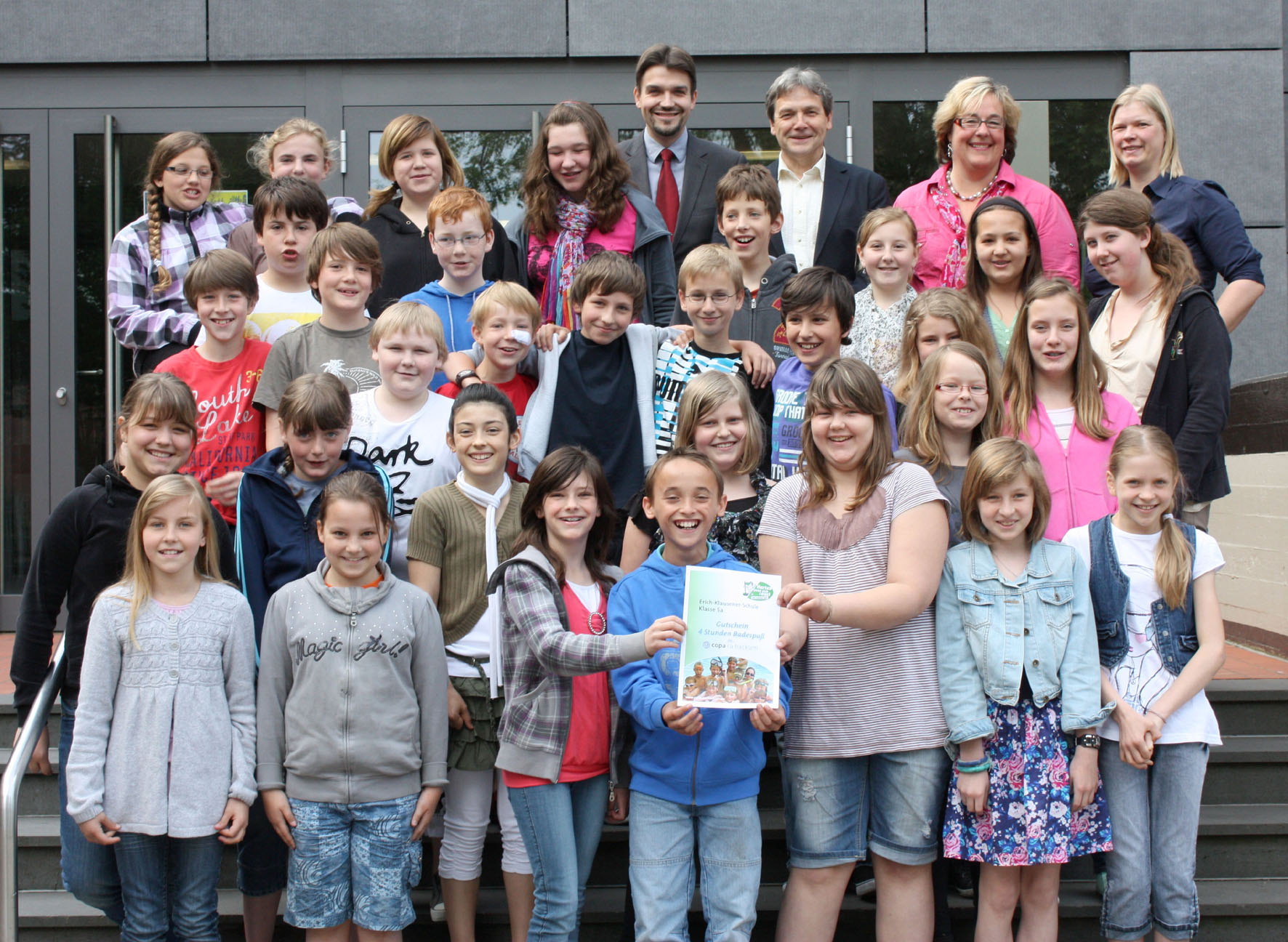 Die Klasse 5a der Erich-Klausener-Schule mit Bürgermeister Dr. Uli Paetzel, Vera Zimmermann (ZBH) und Klassenlehrerin Christiane Slowinski.