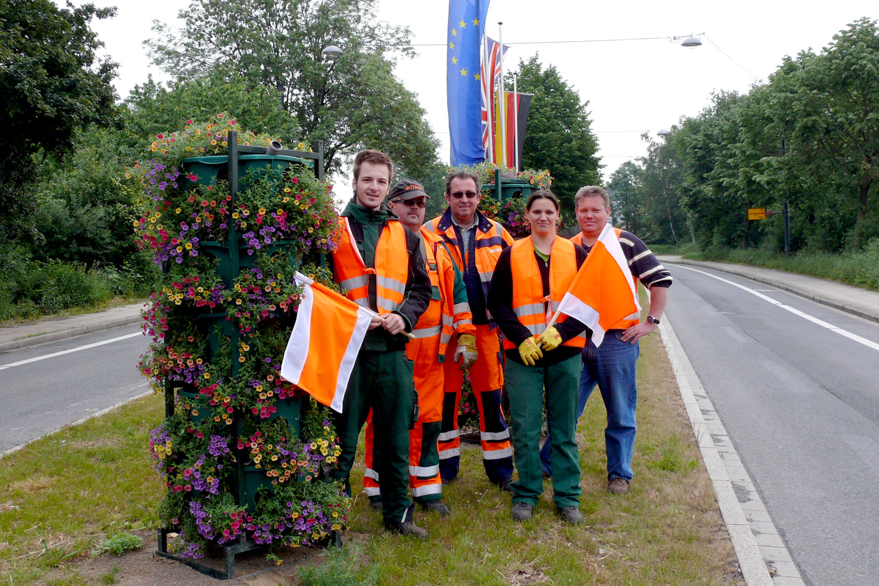 Die Frauen und Männer vom städtischen Bereich Grün sorgen für die Aufstellung der bunten Blumenampeln: Sergej Jegel (Praktikant), Franz Germanski, Ulli Reiners, Julia Rüdebusch und Christian Zerta (v.l.). Nicht auf dem Bild: Radladerfahrer Hubert Simon.