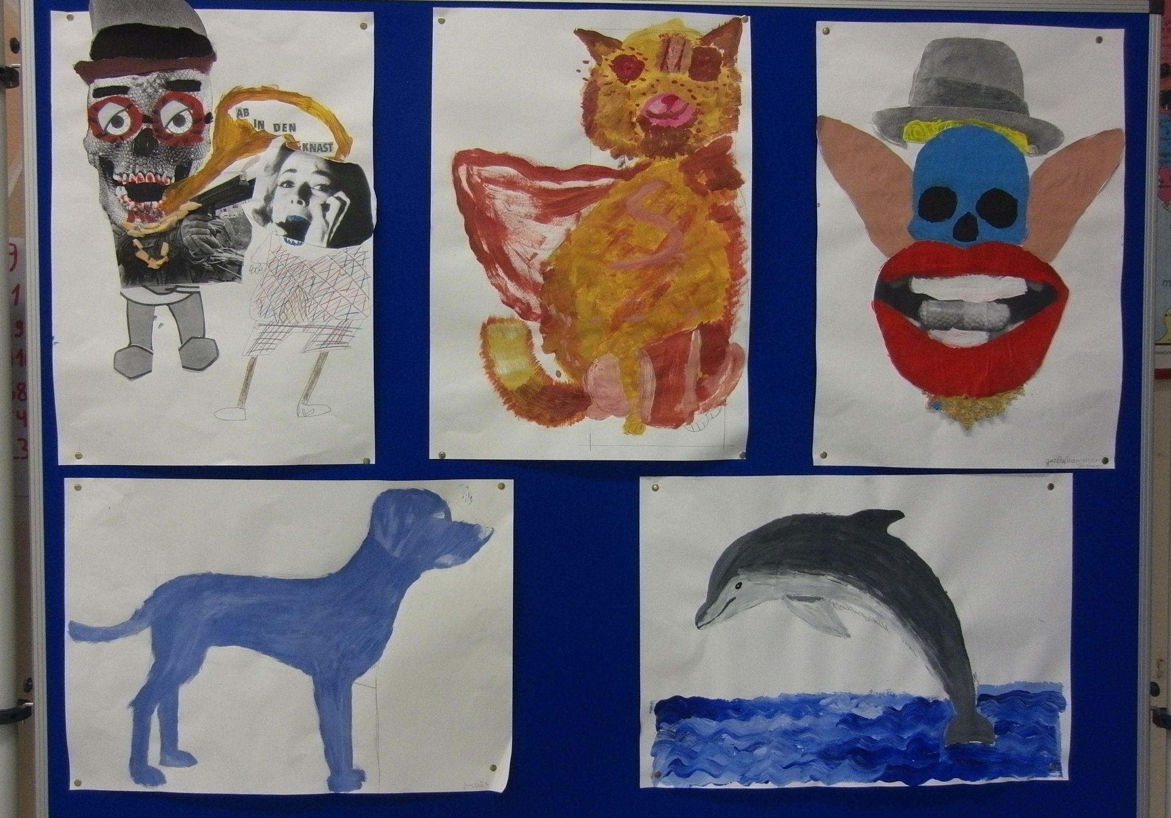 Für ihr Projekt "Ein Jahr mit Kunst gestalten" malten die Schüler einen lustigen Clowns-Hund (rechts oben) oder einen aggressiven Kamphund (links oben). Foto: Kreis Viersen / Abdruck honorarfrei