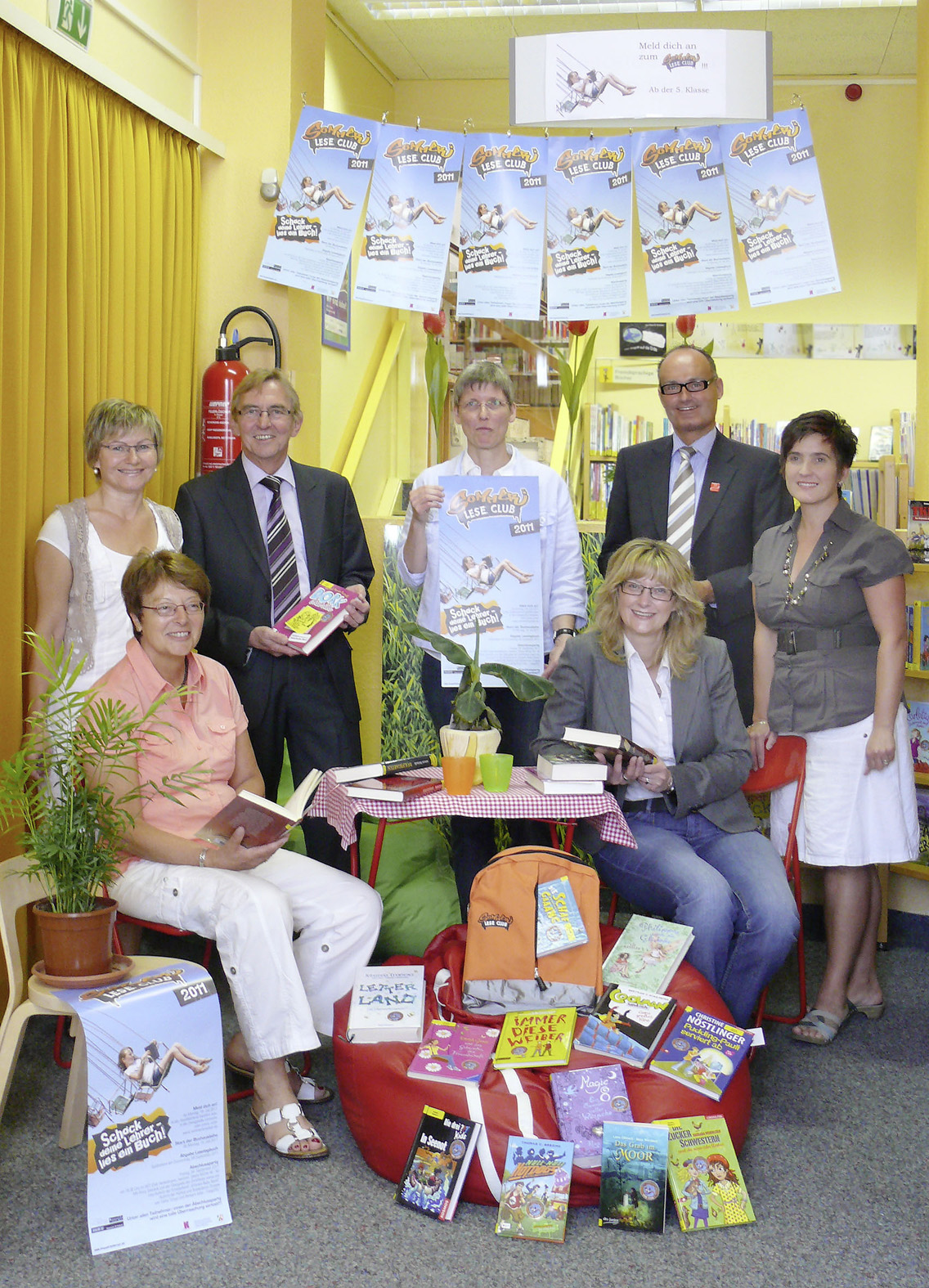 Bürgermeister Dr. Peter Paul Ahrens (2.v.l.) bedankte sich gemeinsam mit dem Team der Stadtbücherei Iserlohn bei Michael Haupt von der Sparkasse Iserlohn und Christina Rinke (2.u.3.v.r.) von der Buchhandlung Mayersche Potthoff für die erneute Unterstützung des Leseförderungsprojektes “SommerLeseClub”.