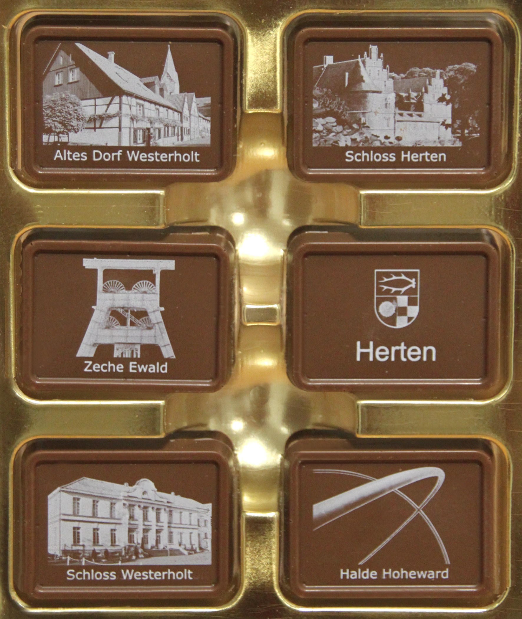 Fotorealistische Aufdrucke des Alten Dorfes, der beiden Schlösser, der ehemaligen Zeche Ewald, der Halde Hoheward und des Hertener Stadtwappens zieren die Schokoladentafeln.