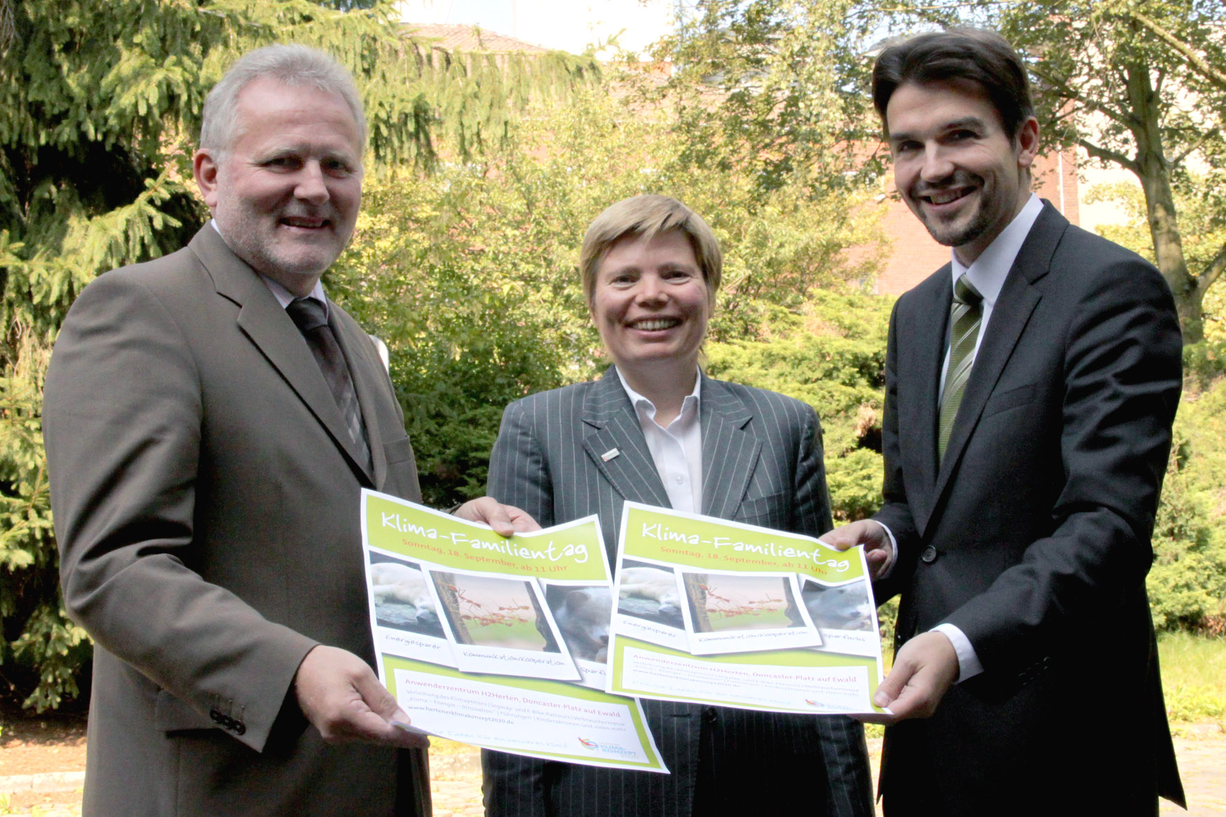 Gisbert Büttner (Geschäftsführer Hertener Stadtwerke), Dr. Babette Nieder (Stadt Herten) und Bürgermeister Dr. Uli Paetzel bewerben die 1. Hertener Klimatage auf Ewald.