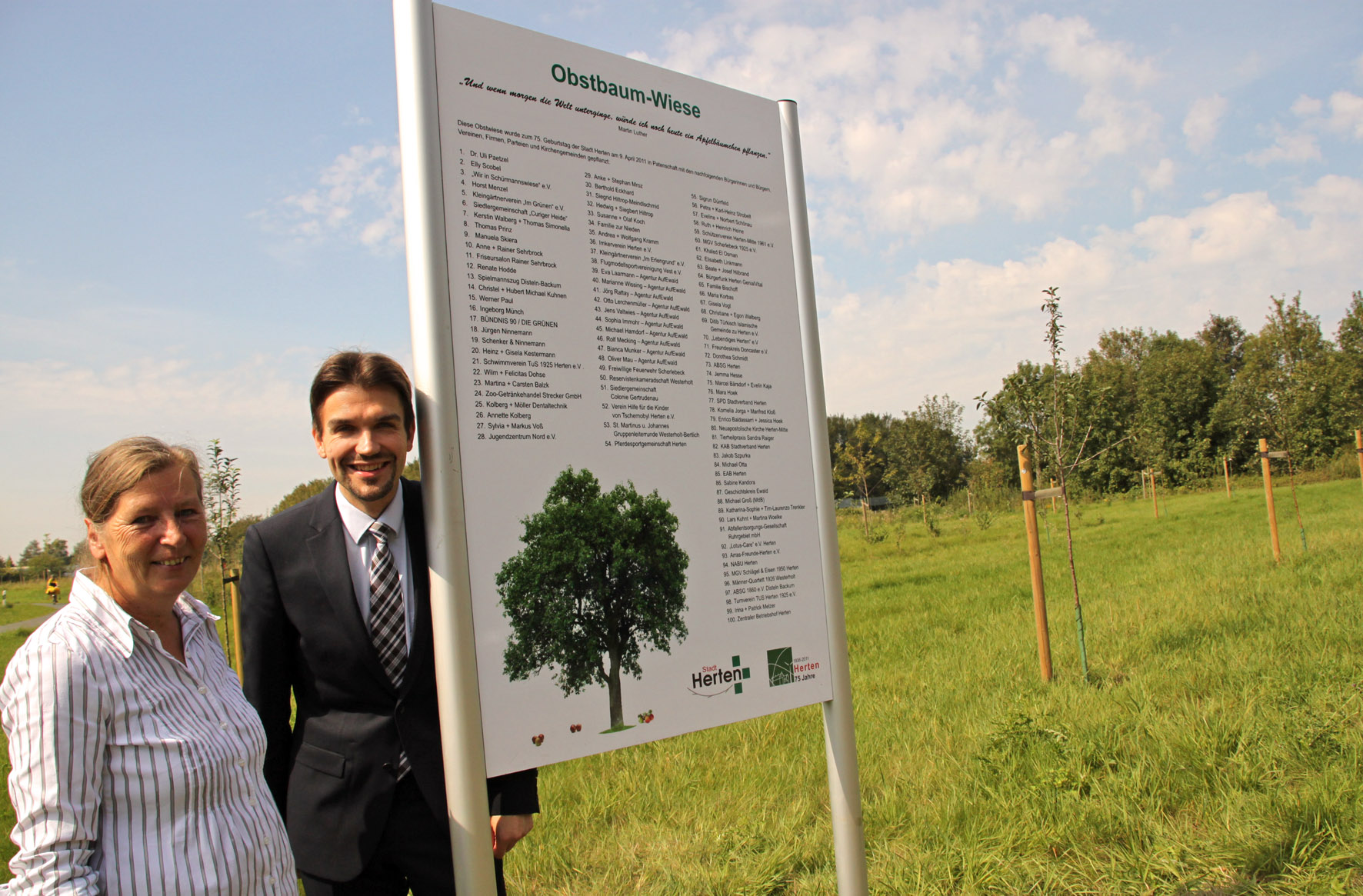 ZBH-Bereichsleiterin Elke Günter und Bürgermeister Dr. Uli Paetzel präsentieren die neue Tafel auf der Obstwiese an der Westerholter Straße.