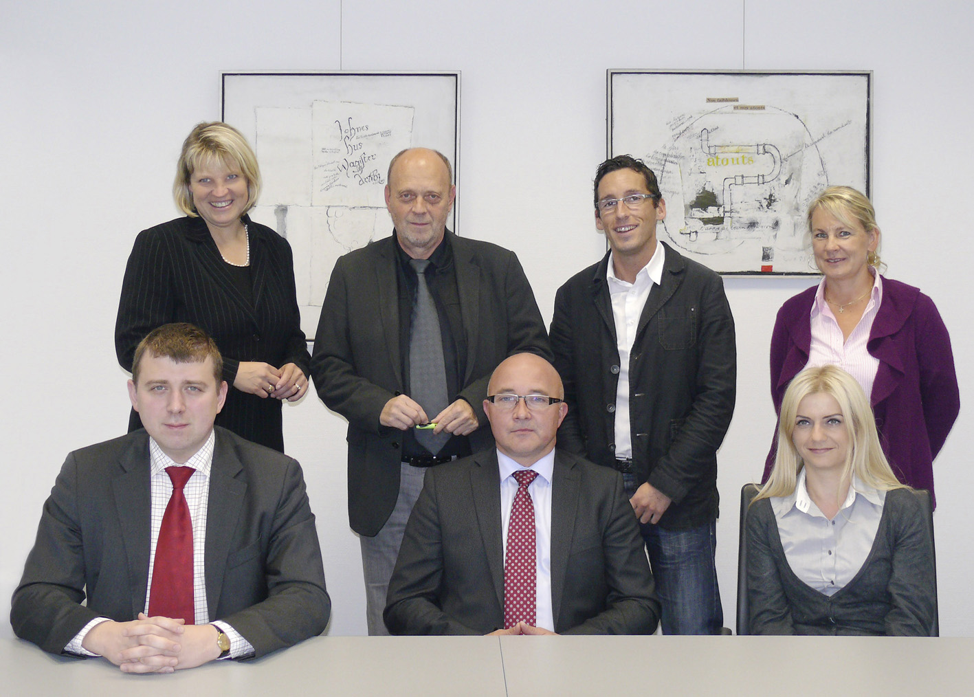 Bürgermeister Andrzej Kotala (v.m.) und sein Stellvertreter Marcin Michalik (l.) aus der polnischen Partnerstadt Chorzów, begleitet von Dolmetscherin Anja Wojtas (v.r.), wurden im Iserlohner Rathaus begrüßt von der Ersten Beigeordneten Katrin Brenner (2.v.l.), der Vorsitzenden des Chorzów-Komitees Karina Markiewicz (h.r.), Bürgermeisterreferatsleiter Karl Fels (3.v.l.) und Europabeauftragtem Matthias Quaschnik (3.v.r.).