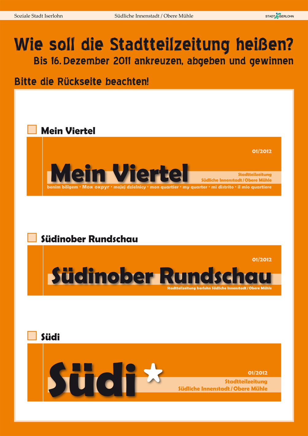 Alle Bewohner des Stadtteils Südliche Innenstadt / Obere Mühle und alle Interessierten können mit dieser Stimmkarte an der Abstimmung über den Namen der Stadtteilzeitung teilnehmen.