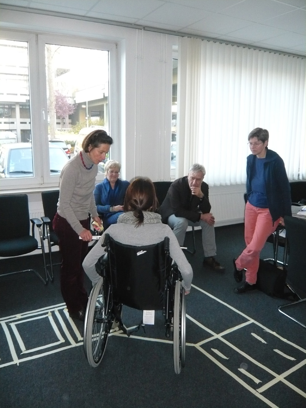 Bei einer praktischen Übung mit Hilfe eines Küchengrundrisses und eines Rollstuhles lernten die Seminarteilnehmer mögliche Hindernisse aber auch Vorteile der richtigen Anordnung der einzelnen Küchenelemente kennen.