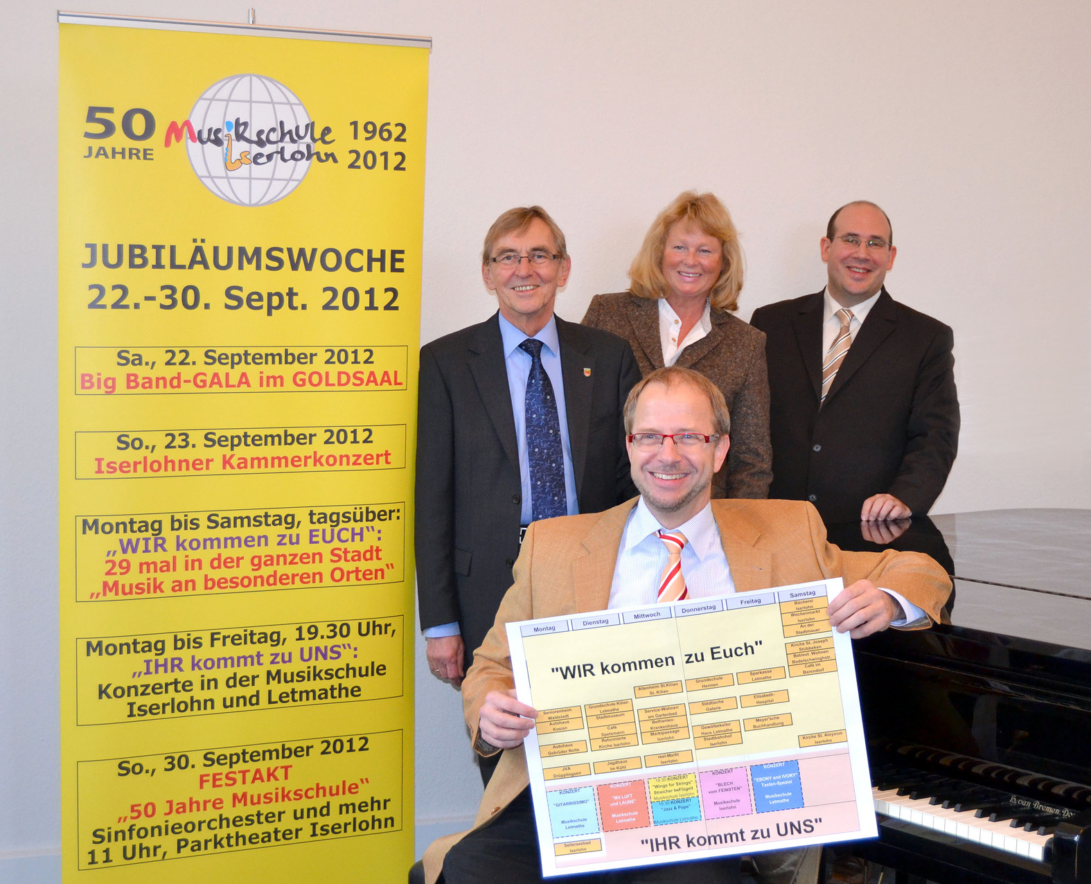 Bürgermeister und Kulturressortleiter Dr. Peter Paul Ahrens, Tone Johansen-Junius, Vorsitzende des Freundeskreises der Musikschule, Stefan Beumers, Veranstaltungsmanager der Musikschule (stehend v.l.) und Musikschulleiter Paul Breidenstein stellten bei einem Pressetermin das Programm für das Jubiläum "50 Jahre Musikschule Iserlohn" in 2012 vor.