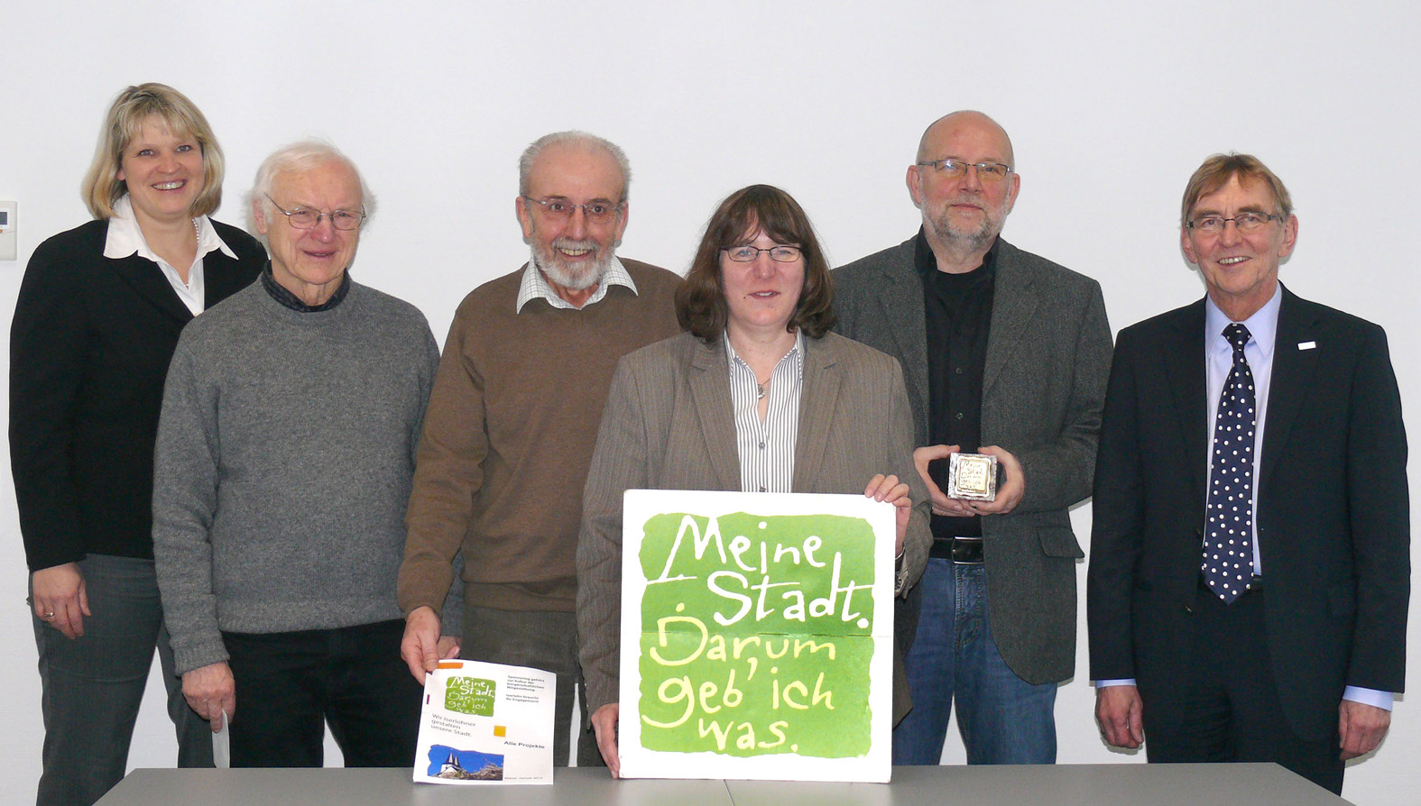 Erste Beigeordnete Katrin Brenner, Peter Bochynek von der Kinderlobby, der neue Projekt-Koordinator Karl-Friedrich-Jansen, die bisherige Projekt-Koordinatorin Petra Grieger, Dr. Ulrich Bildheim und Bürgermeister Dr. Peter Paul Ahrens (v.l.) bei der Überreichung der Ehrengabe der Sponsoring-Aktion "Meine Stadt. Darum geb’ ich was."