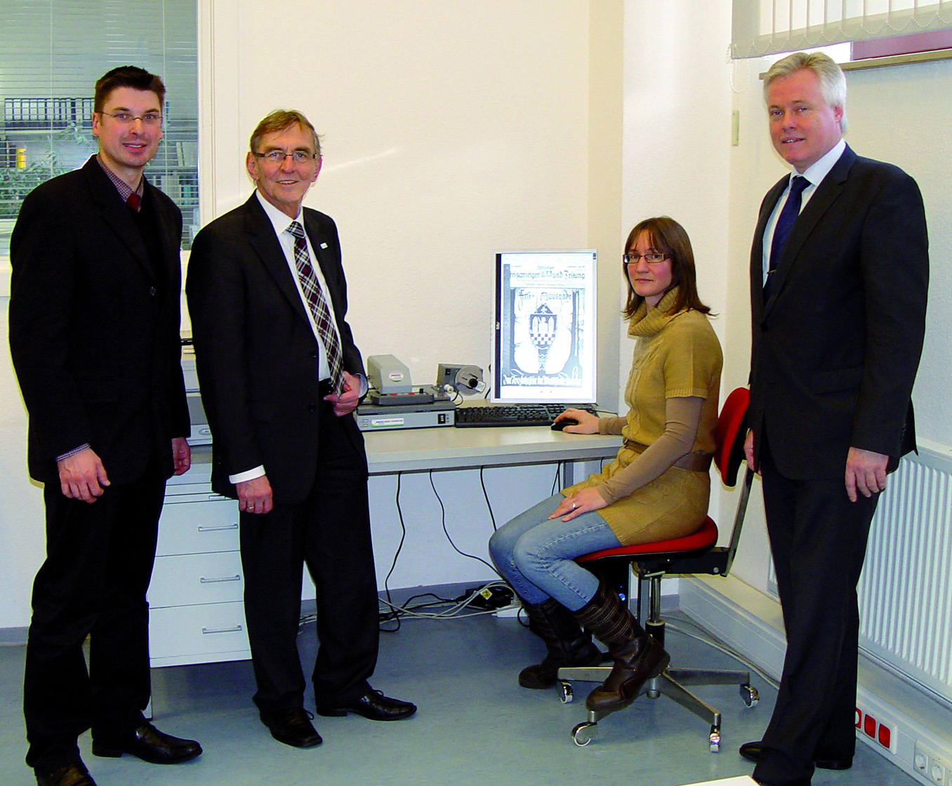 Rico Quaschny, Leiter des Stadtarchives, Bürgermeister Dr. Peter Paul Ahrens, Archiv-Mitarbeiterin Tanja Marschall-Wach und Sparkassen-Vorstandsvorsitzender Dr. Christoph Krämer (v.l.) bei der Übergabe des neuen Mikrofilmscanners.