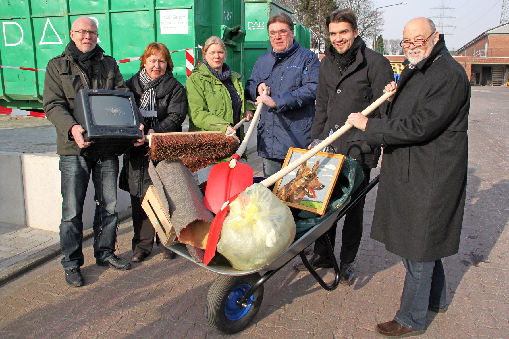 v. li.: Peter Kremer (Techn. Leiter ZBH), Helene Langner (Bereichsleitung Abfallwirtschaft), Vera Zimmermann (Koordinatorin Putztag, ZBH), Winfried Kunert (stellv. Bürgermeister), Bürgermeister Dr. Uli Paetzel und Karl-Heinz Forst (stellv. Bürgermeister).