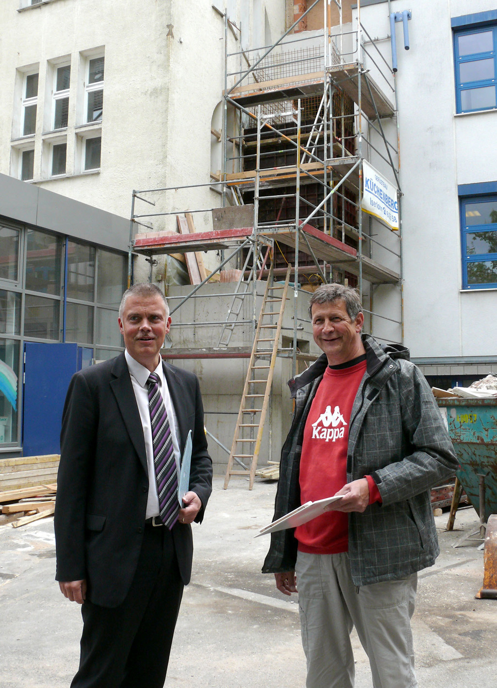 Olaf Pestl, Leiter des Ressorts Planen, Bauen, Umwelt- und Klimaschutz (l.), und Objektbetreuer Hermann Noll vom Kommunalen Immobilien Management erläuterten bei einem Pressetermin den Stand beim Um- und Ausbau der ehemaligen Hauptschule Brüderstraße.