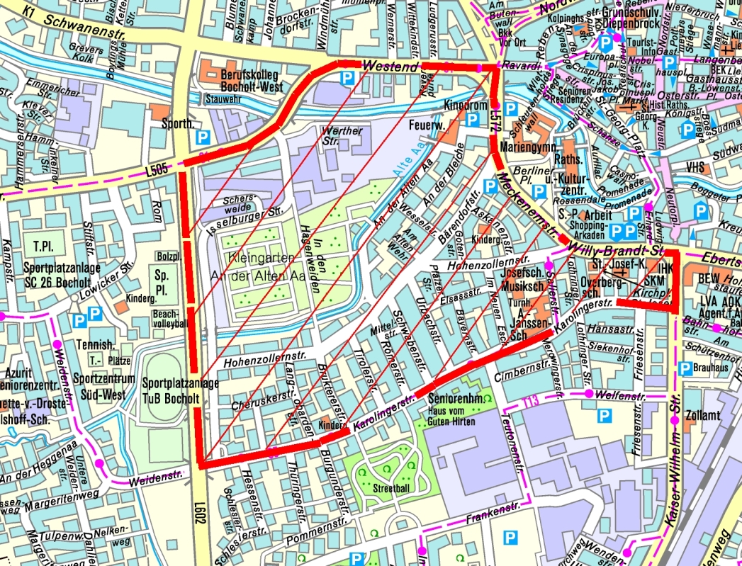 Im Umkreis des Brandherdes an der Schersweide wurden Rußpartikel entdeckt, die nun untersucht werden. Bis dahin wird empfohlen, auf selbst angebautes Blattgemüse zu verzichten. (Plan: Stadt Bocholt)