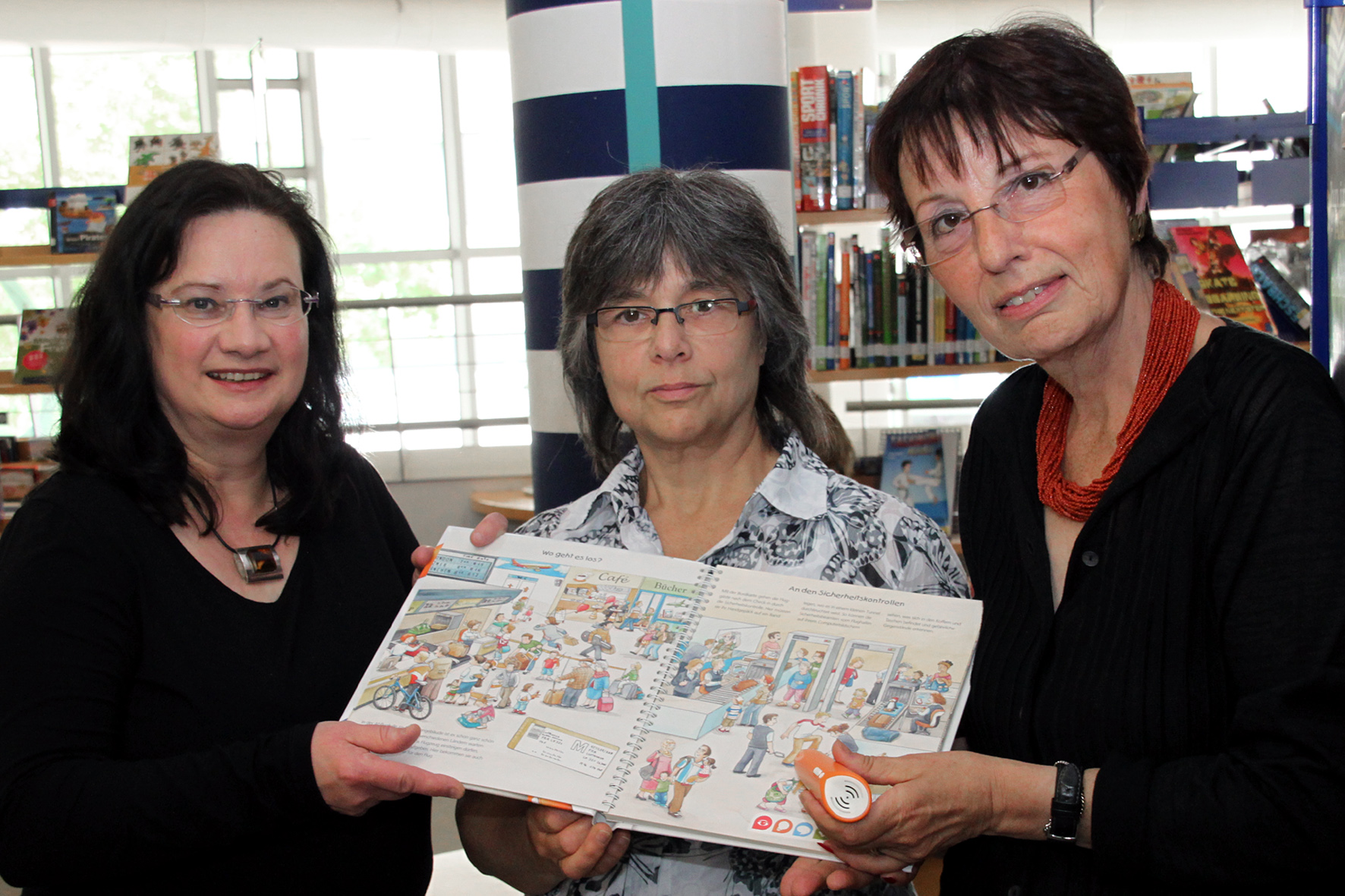 v. li.: Marie-Luise Karla, stellvertretende Leiterin der Stadtbibliothek, Mitarbeiterin Bärbel Roggon und Dr. Reinildis Hartmann, stellvertretende Leitung des Fördervereins freuen sich über viele neue gespendete Medien.