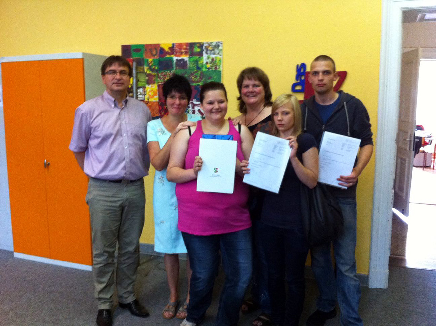 Jugendamtsleiter Kai Maibaum, Claudia Bawey und Jutta Körling (h.R.v.l.) freuten sich mit den Absolventen des externen Hauptschulabschlusses.