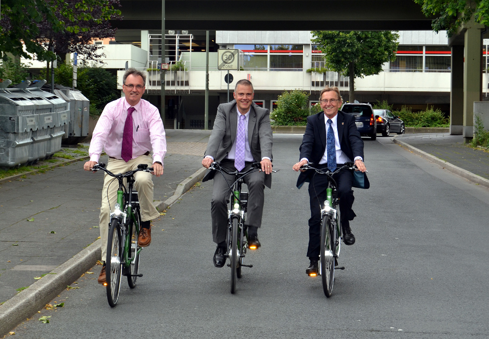 Stadtwerke-Geschäftsführer Dr. Klaus Weimer (l.), Olaf Pestl, Leiter des Ressorts Planen, Bauen, Umwelt- und Klimaschutz (m.), und Bürgermeister Dr. Peter Paul Ahrens beim "Praxistest".