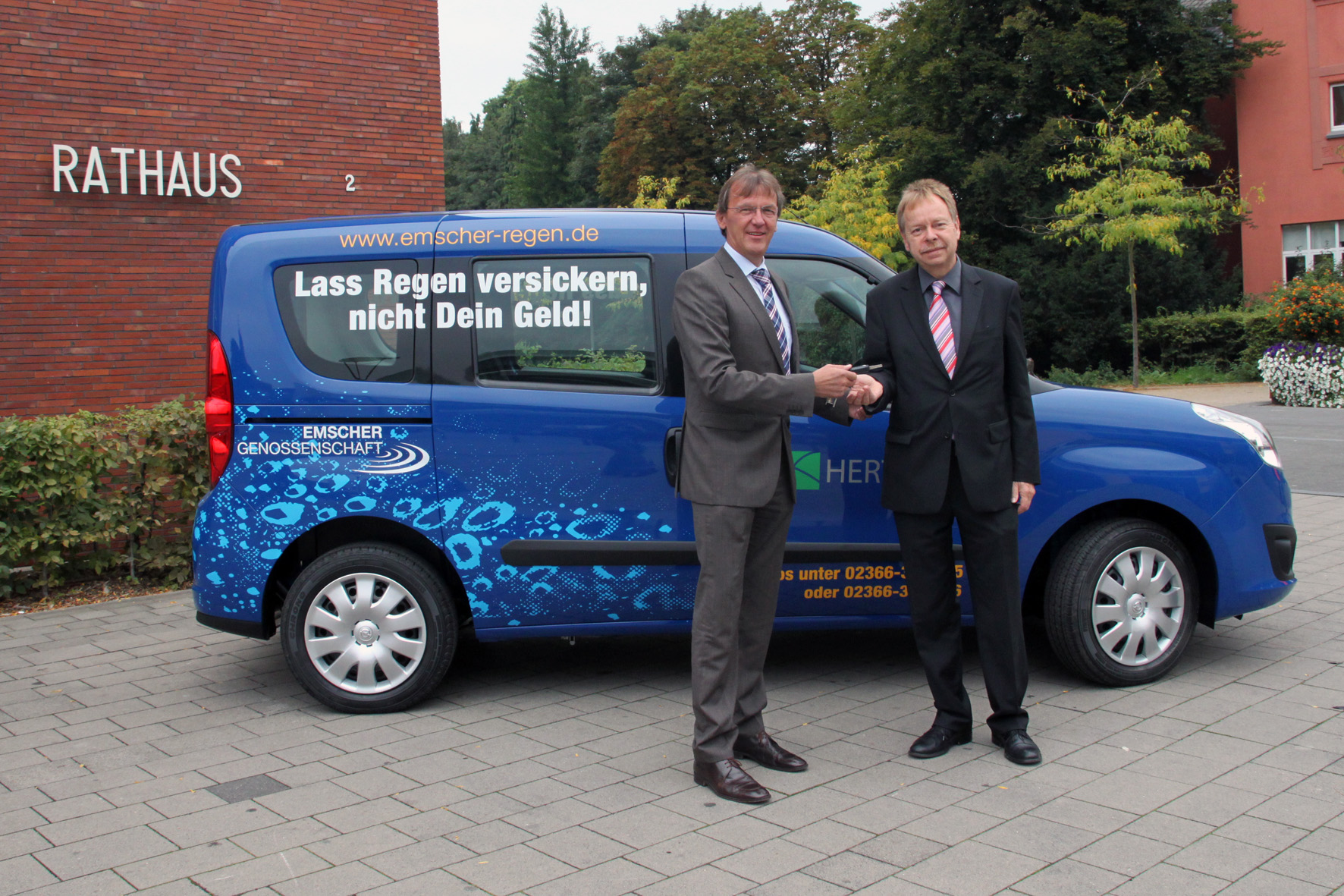 Technik-Vorstand der Emschergenossenschaft, Dr. Emmanuel Grün (links), übergibt den Schlüssel für das „Regenwasser-Auto“ an den Stadtbaurat Volker Lindner.