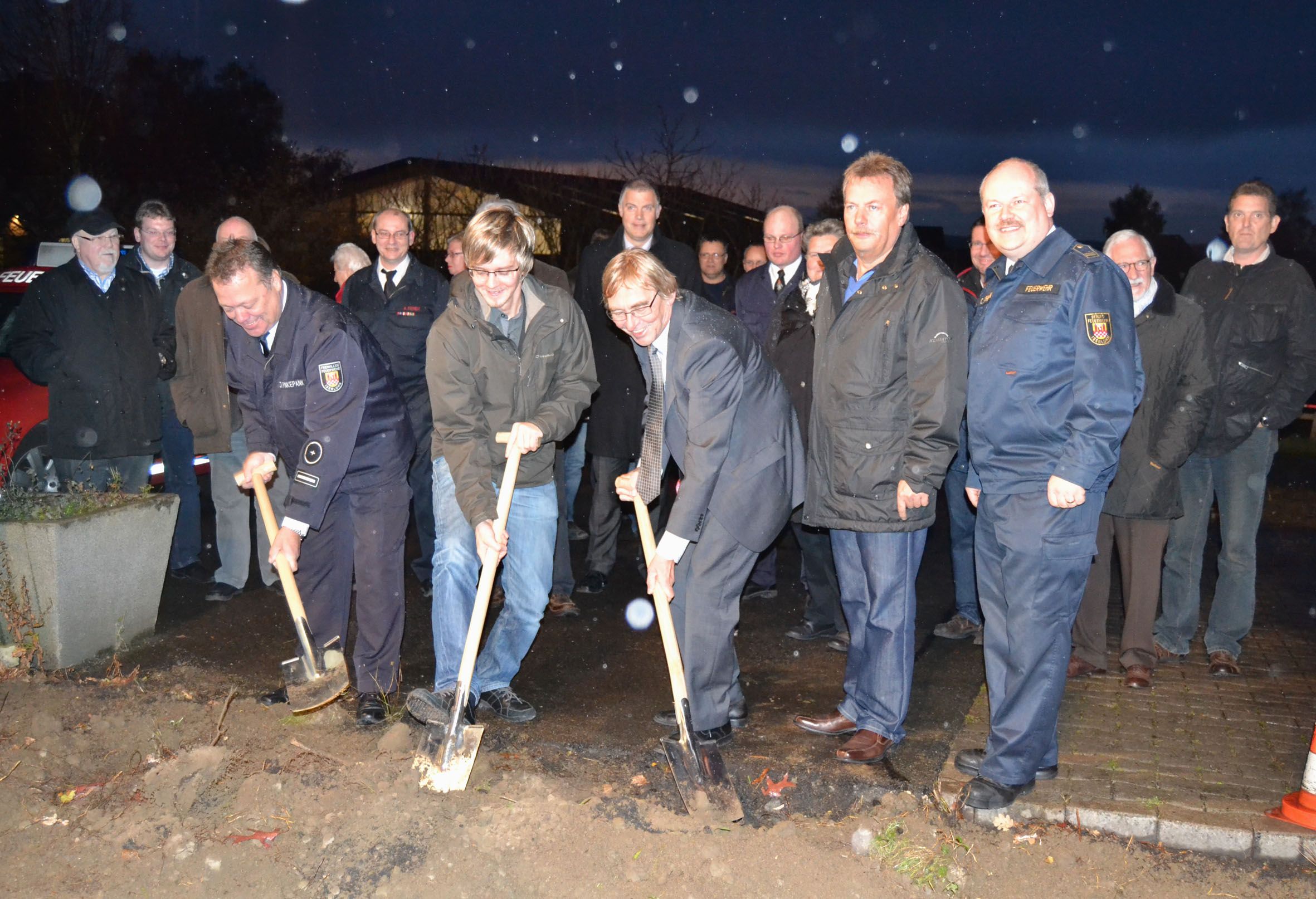 Beim ersten Spatenstich: Jürgen Pinkepank, Leiter der Löschgruppe Sümmern, KIM-Architekt Markus Balk, Bürgermeister Dr. Peter Paul Ahrens sowie Feuerwehrausschuss-Vorsitzender Michael Barth und Feuerwehr-Leiter Christian Eichhorn.