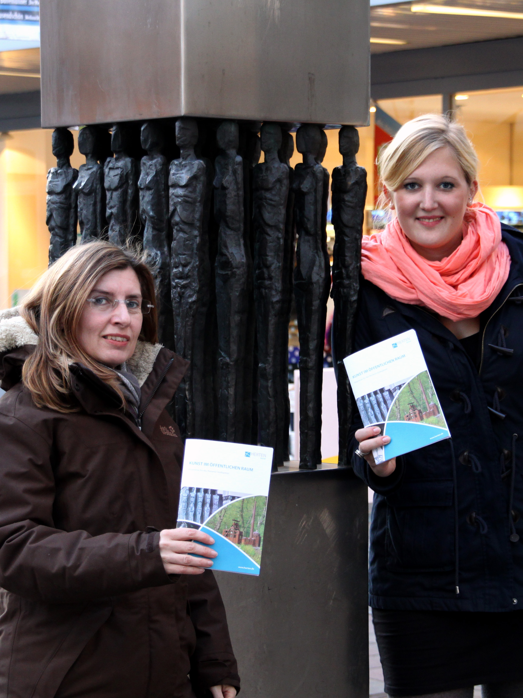 Sylvia Seelert (links) vom Kulturbüro Stadt Herten und die Studentin der Kunstgeschichte Mareike Donath (rechts) stellen die neue Broschüre 'Kunst im öffentlichen Raum' vor.