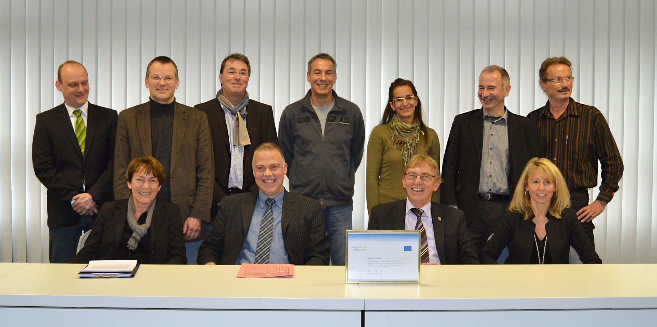 Klimaschutzbeauftragte Ulrike Jostmann, Bürgermeister Dr. Peter Paul Ahrens, Ressortleiter Olaf Pestl (sitzend von links) und die Mitglieder des Energie-Teams freuten sich über die hohe Auszeichnung.