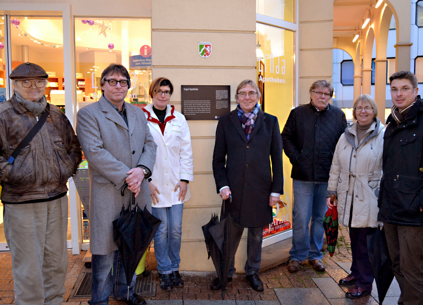 Eine der ersten Informationstafeln zur Revolution 1848/49 an historisch bedeutsamen Orten im Innenstadtbereich befindet sich am Gebäude der Engel-Apotheke am Alten Rathausplatz. Bei einem Pressetermin stellte Bürgermeister Dr. Peter Paul Ahrens (M.) gemeinsam mit (v.l.) Ideengeber Armin Kligge, Rotary Club-Präsident Reinhard Adam, Apothekerin Karin Alfke, Museumsleiter Gerd Schäfer, Stadtführerin Marlis Gorki und Stadtarchivar Rico Quaschny das Projekt Infotafeln vor.