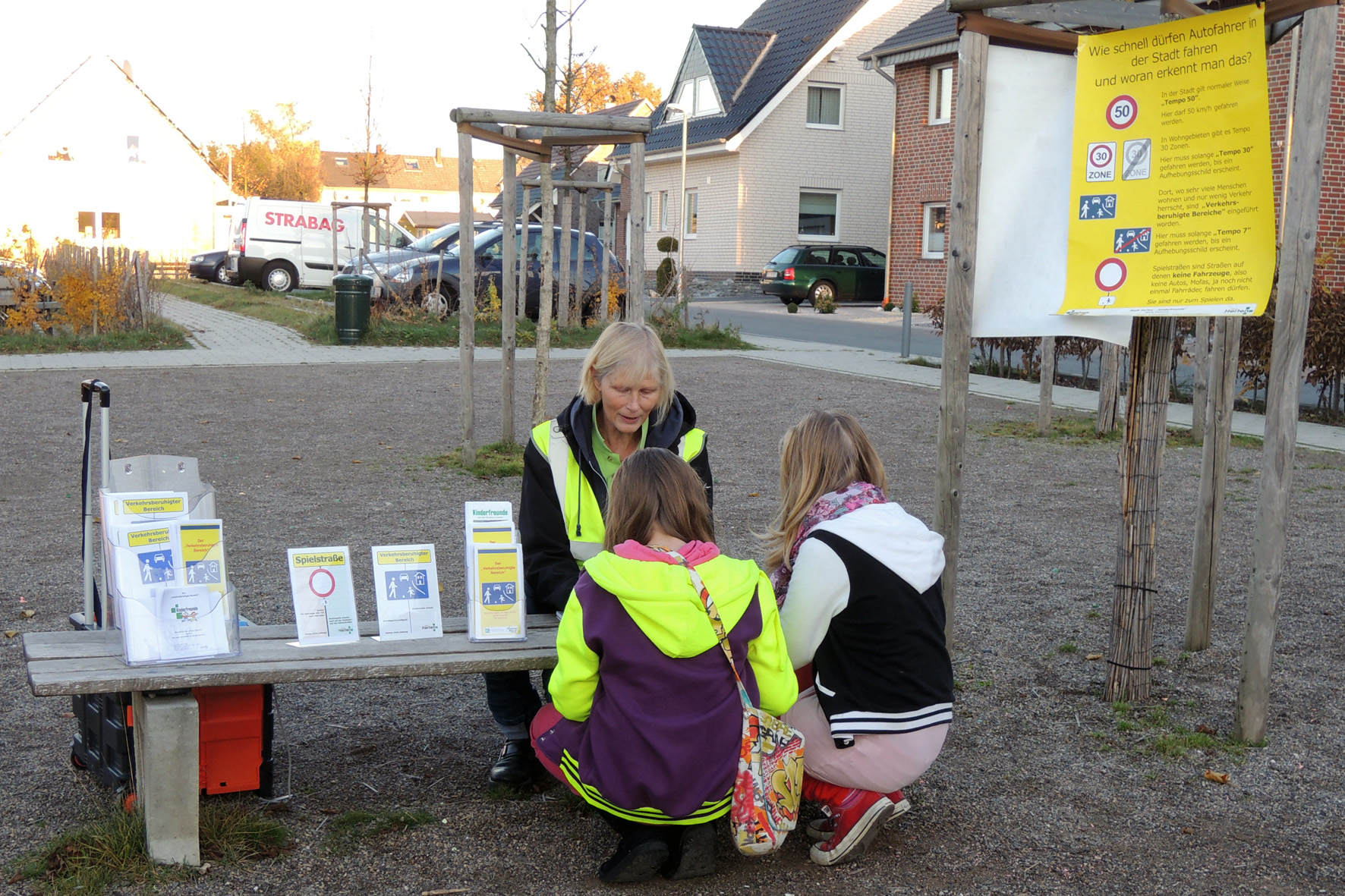 Kinderfreundin Beate Kleibrink informiert Anwohner und Kinder in der Freiwiese über den verkehrsberuhigten Bereich.