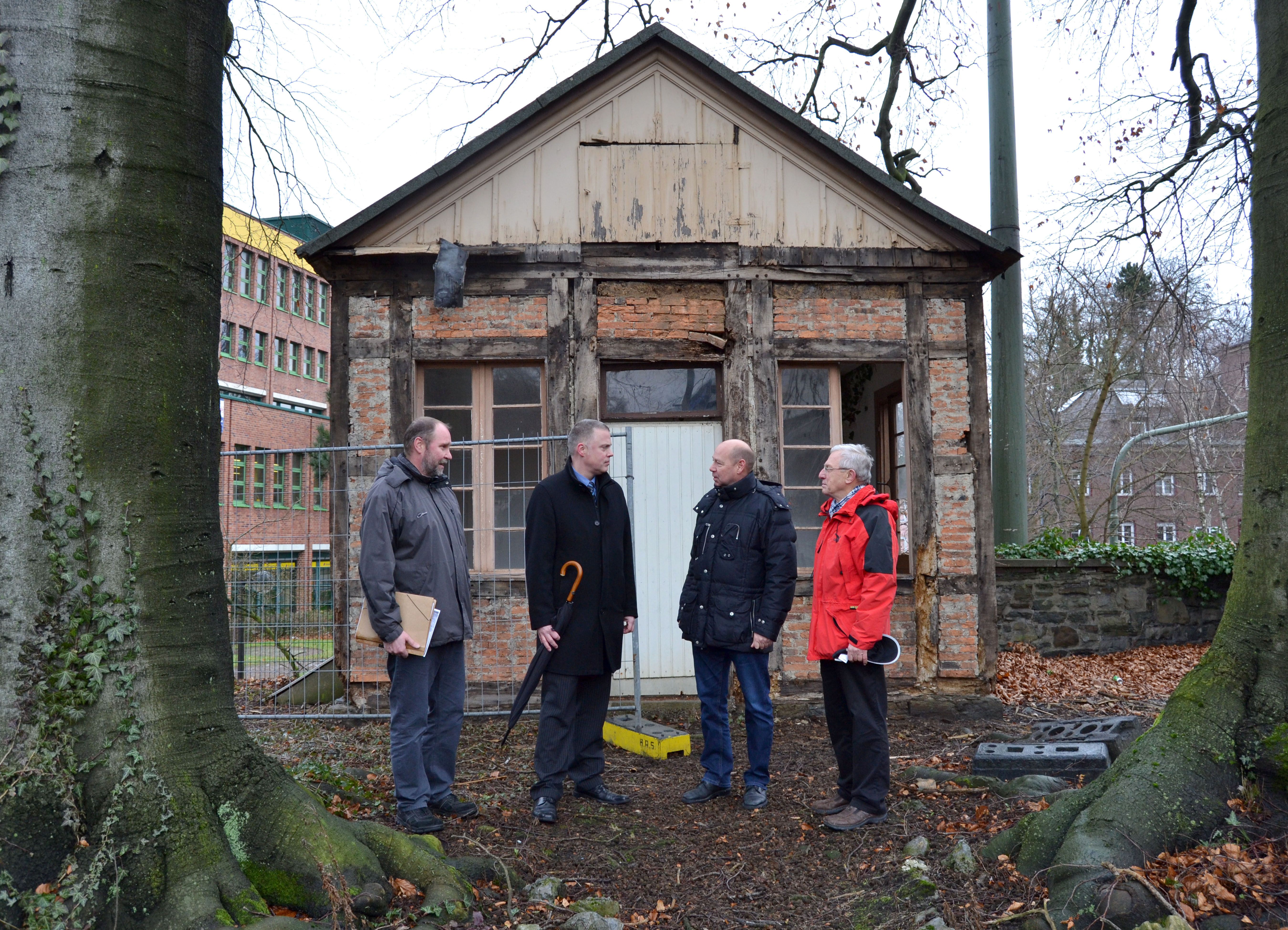 Bei einem Pressetermin erläuterten (v.l.) Michael Knaack von der Abteilung Baufaufsicht und Denkmalpflege, Olaf Pestl, Leiter des Ressorts Planen, Bauen, Umwelt- und Klimaschutz, Gustav Edelhoff als Eigentümer und Lobbe-Bauleiter Hans-Hermann Hupach die Pläne für die Umsetzung des historischen Gartenhauses.