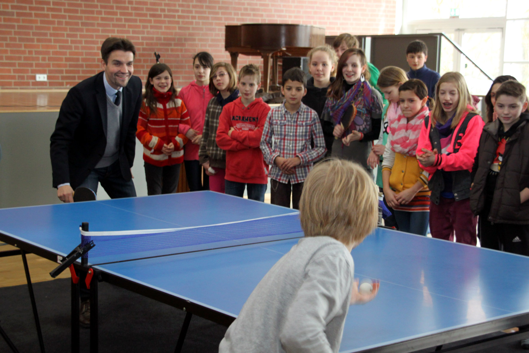 Tischtennisturnier mit dem Bürgermeister. Fabio fordert Dr. Uli Paetzel heraus und wurde kräftig von seinen Mitschülern angefeuert.