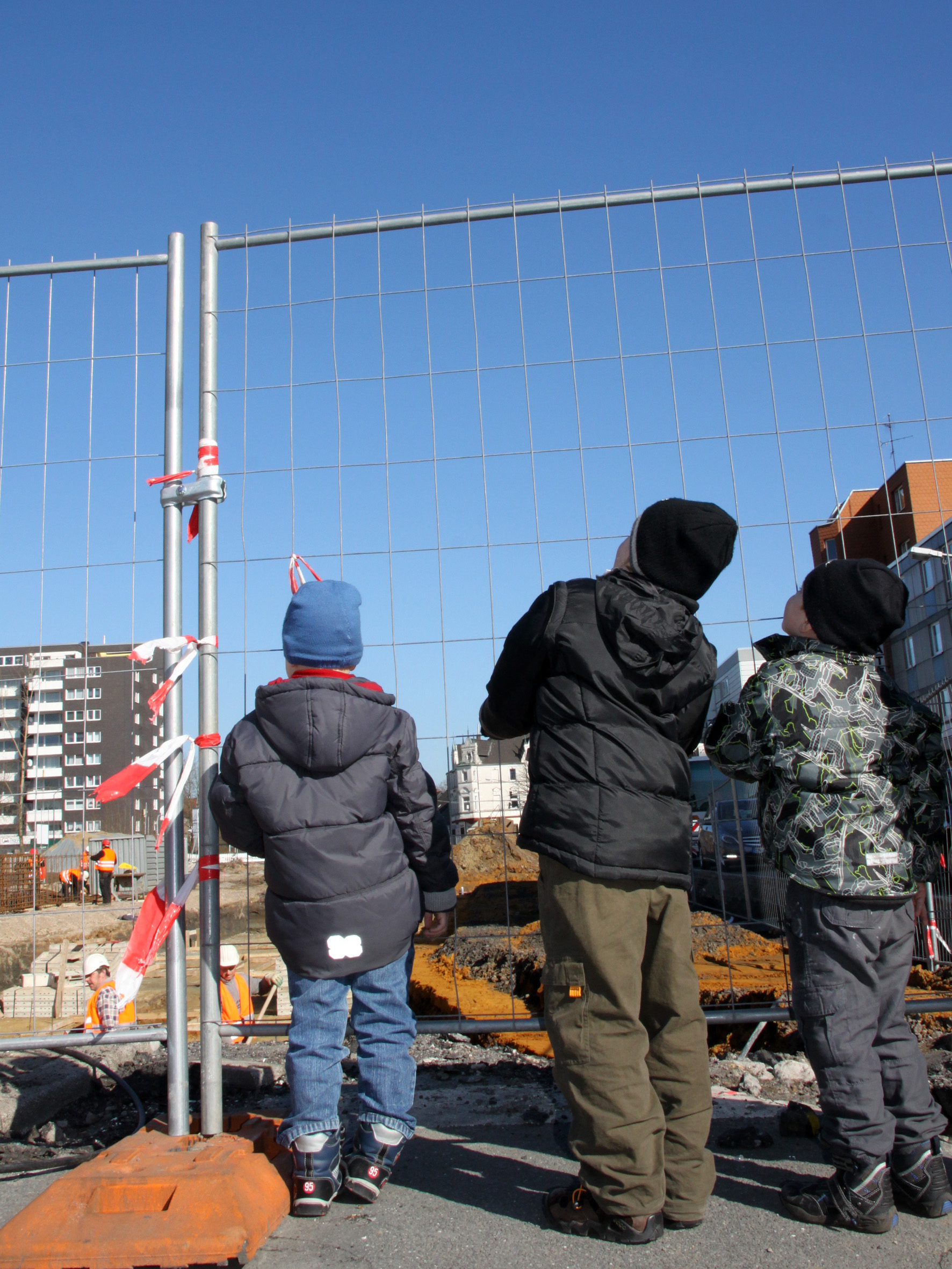 Für drei Jungs aus dem Kindergarten ein spannender Anblick: Sie drücken die Nasen durch den Bauzaun und bestaunen den riesigen Kran und den Betonmischer.