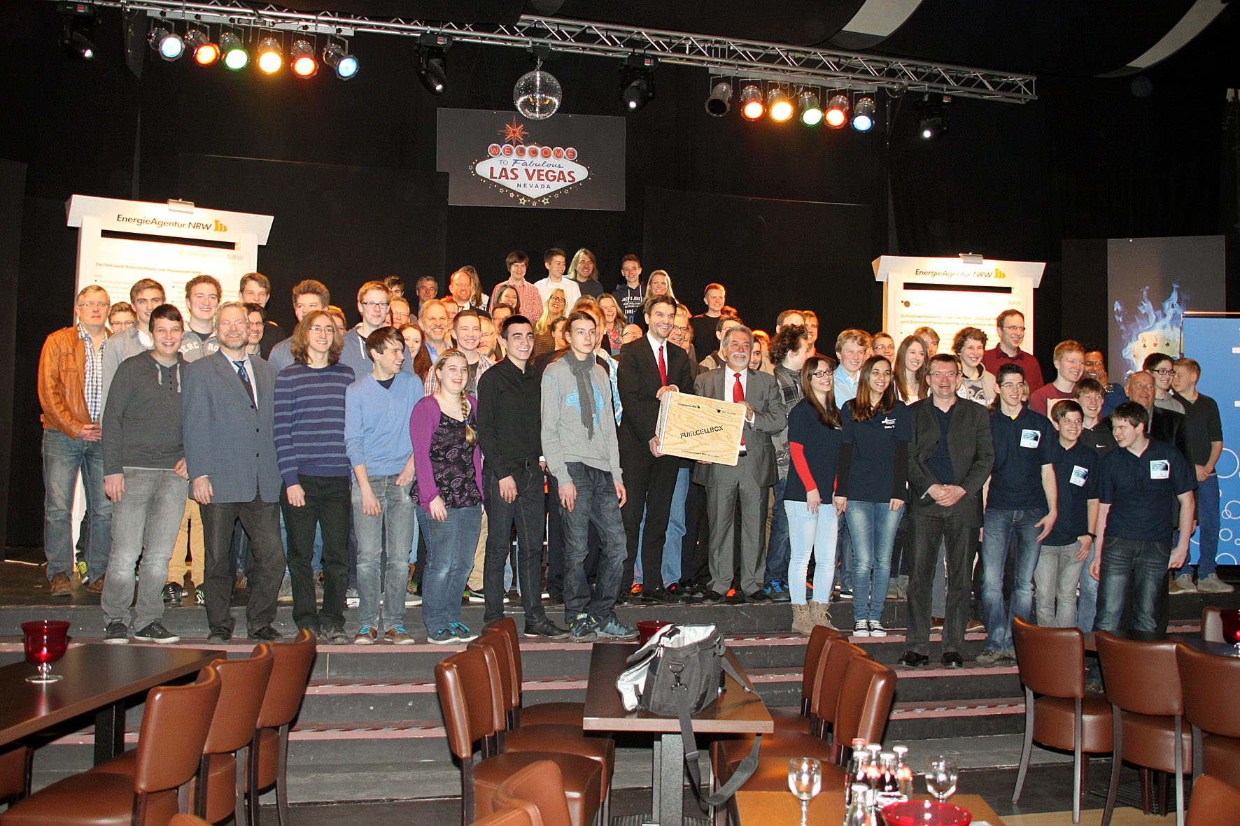 20 Schülergruppen aus ganu Nordrhein-Westfalen holten sich ihre 'Fuel Cell Boxen' ab. Im Vordergrund: Bürgermeister Dr. Uli Patzel sowie Dr. Heinz Baues vom Ministerium für Klimaschutz, Umwelt, Landwirtschaft, Natur- und Verbraucherschutz NRW.