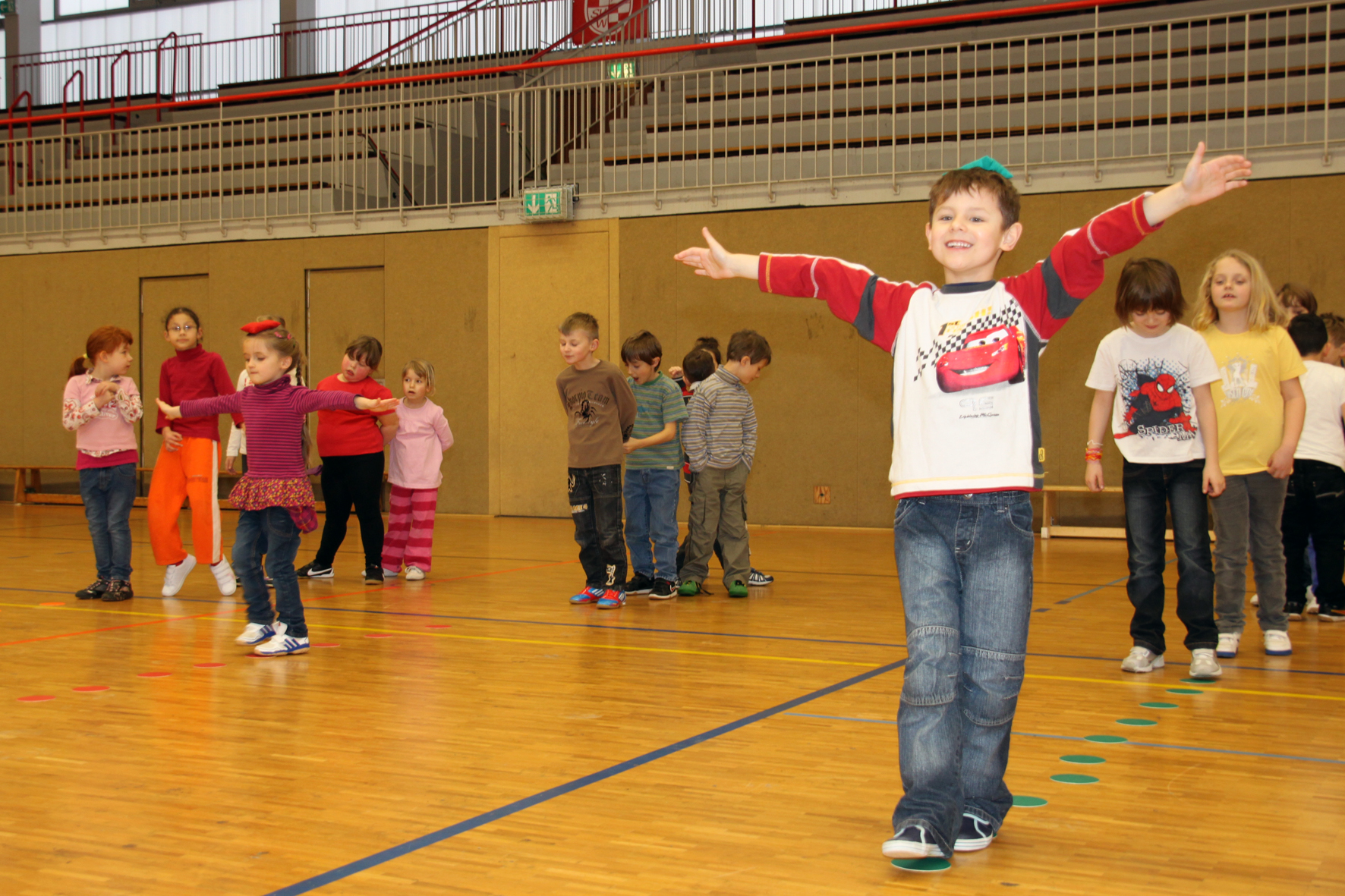 Die Schülerinnen und Schüler üben das Balancieren für ein besseres Körpergefühl.