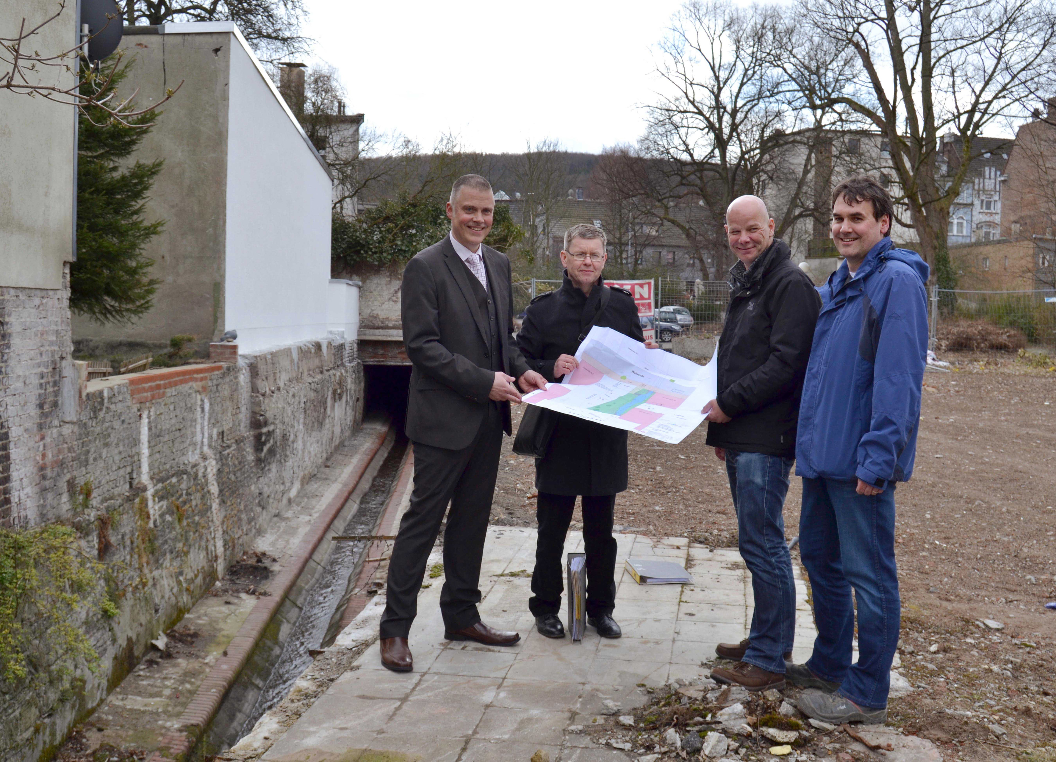 Stellten den Bauablauf zur Offenlegung des Baarbaches vor: (von links) Olaf Pestl, Leiter des Ressorts Planen, Bauen, Umwelt- und Klimaschutz der Stadt Iserlohn, Thomas Sümmermann Geschäftsführer der Sümmermann GmbH, Thomas Sümpelmann vom Ingenieurbüro Düffel und Kai Höffken von der Abteilung Stadtentwässerung der Stadt.