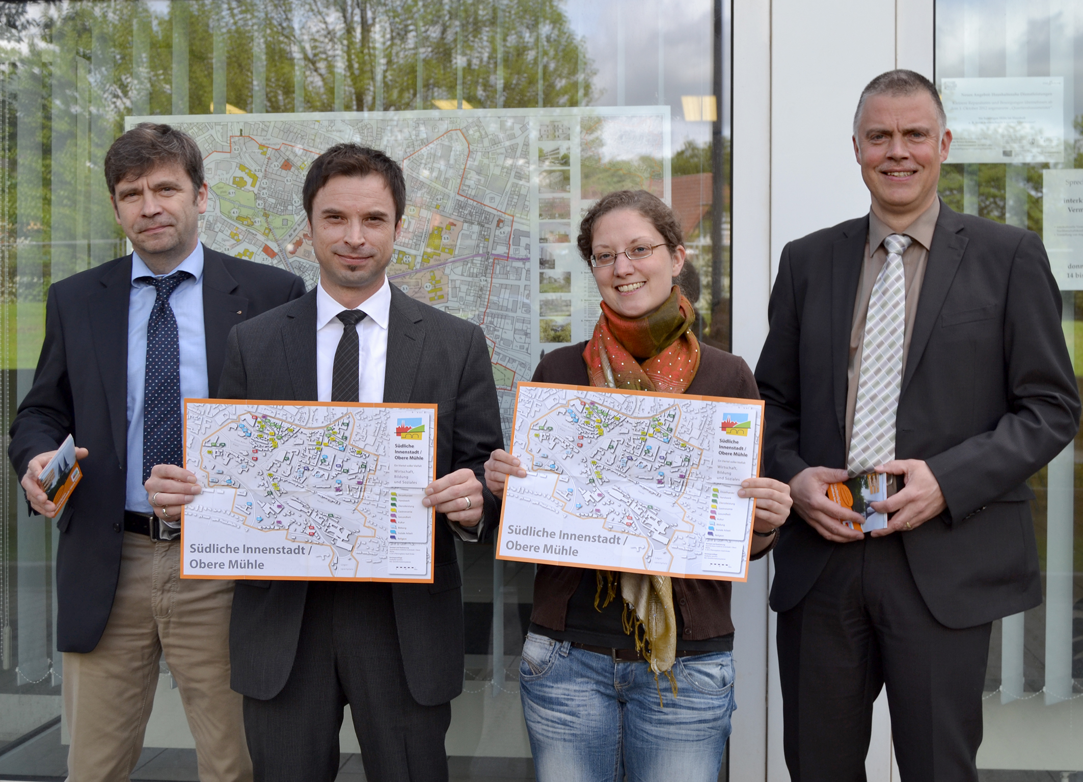 Von links: Thomas Junge und Andreas Wanke (beide GfW) sowie Tabea Rössig vom Quartiersbüro und Olaf Pestl, Leiter des Ressorts Planen, Bauen, Umwelt- und Klimaschutz der Stadt Iserlohn, stellten bei einem Pressetermin den Stadtteilplan vor.