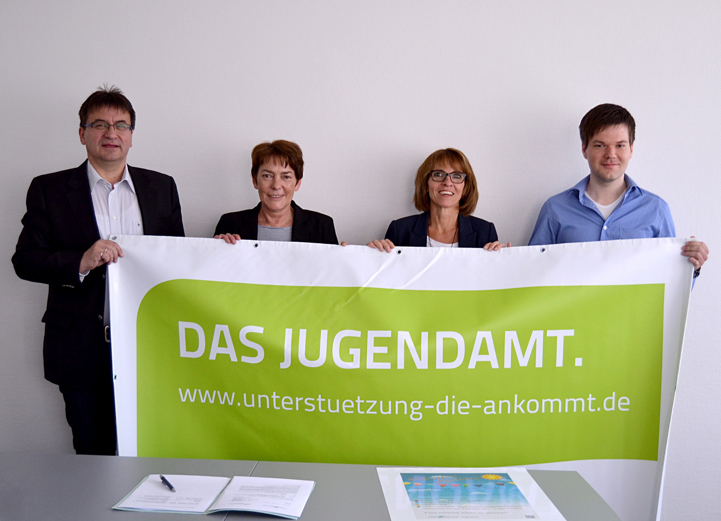 Jugendamtsleiter Kai Maibaum, Medienreferentin Christine Schulte-Hofmann und die Jugendamtsmitarbeiter Sabine Menzel und Manuel Weniger (v.l.) laden alle Interessierten herzlich ein zu den Aktionen im Rahmen der Kampagne „Das Jugendamt. Unterstützung, die ankommt“.