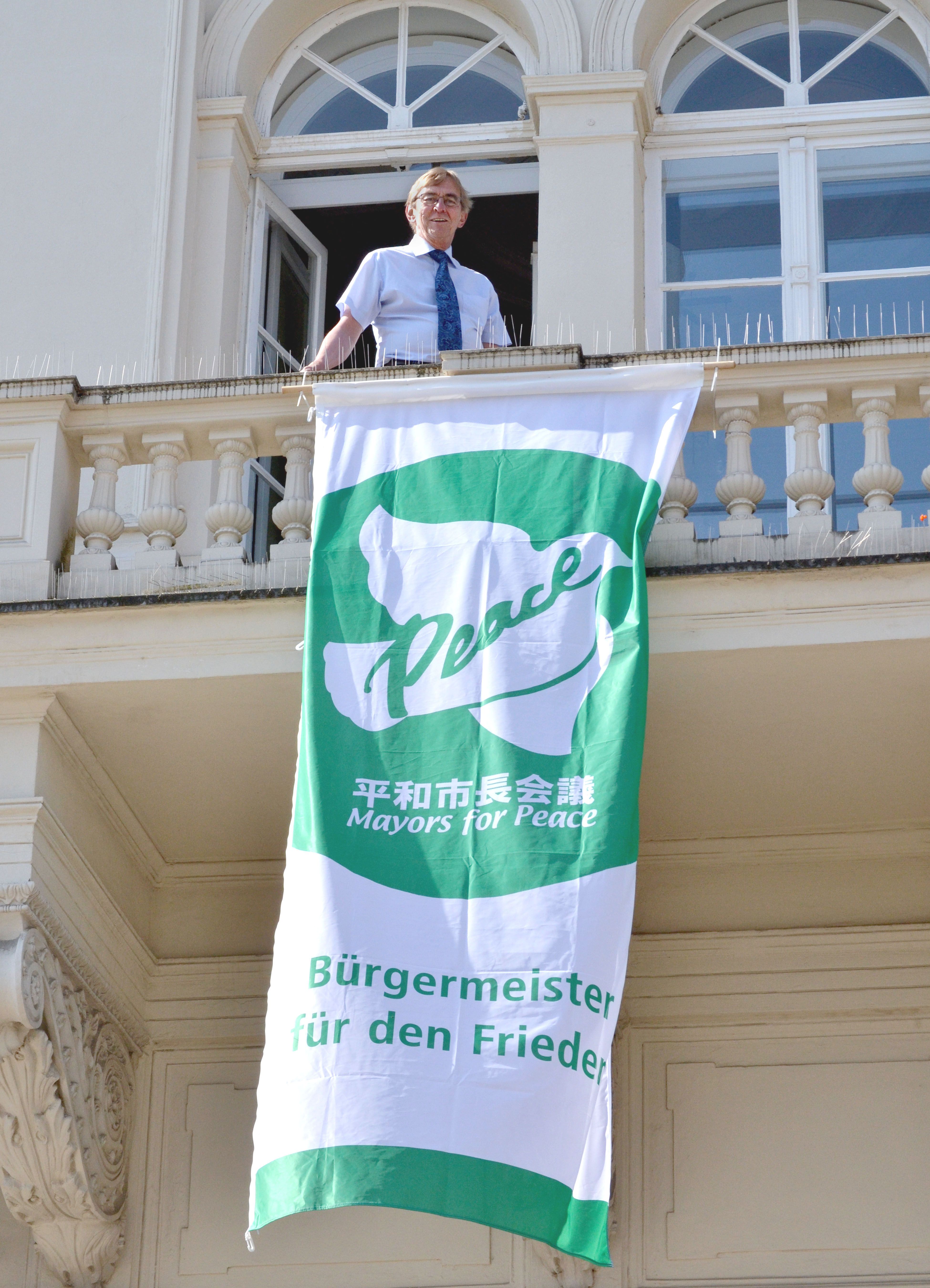 Bürgermeister Dr. Peter Paul Ahrens mit der Flagge der Mayors for Peace.