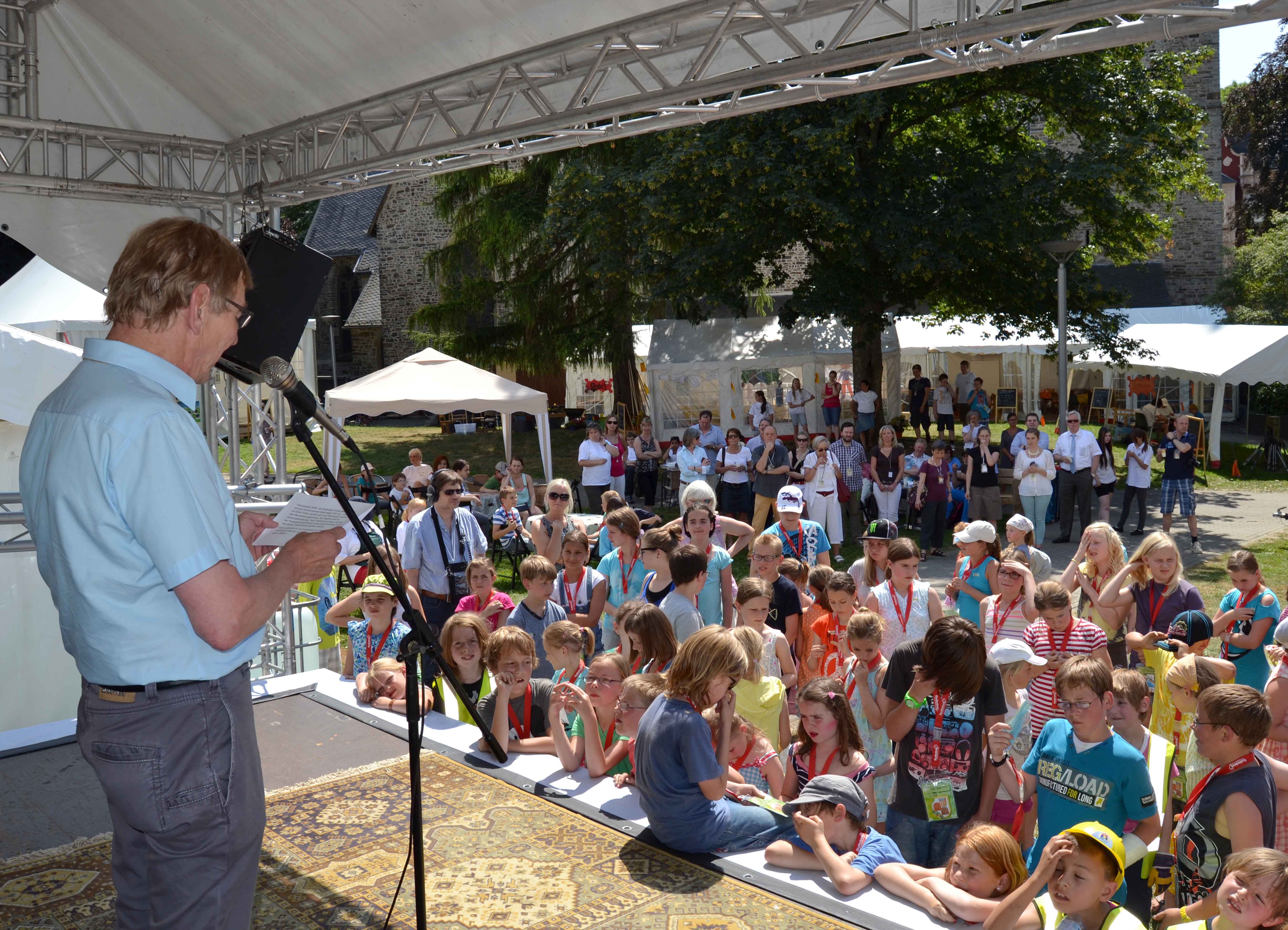 Zur Eröffnung der Kinderstadt versammelte sich das "Volk von Iser-Kid-City" vor der großen Bühne zur ersten “Bürgerversammlung”. Iserlohns Bürgermeister Dr. Peter Paul Ahrens wünschte allen Beteiligten viel Spaß in den nächsten drei Wochen.