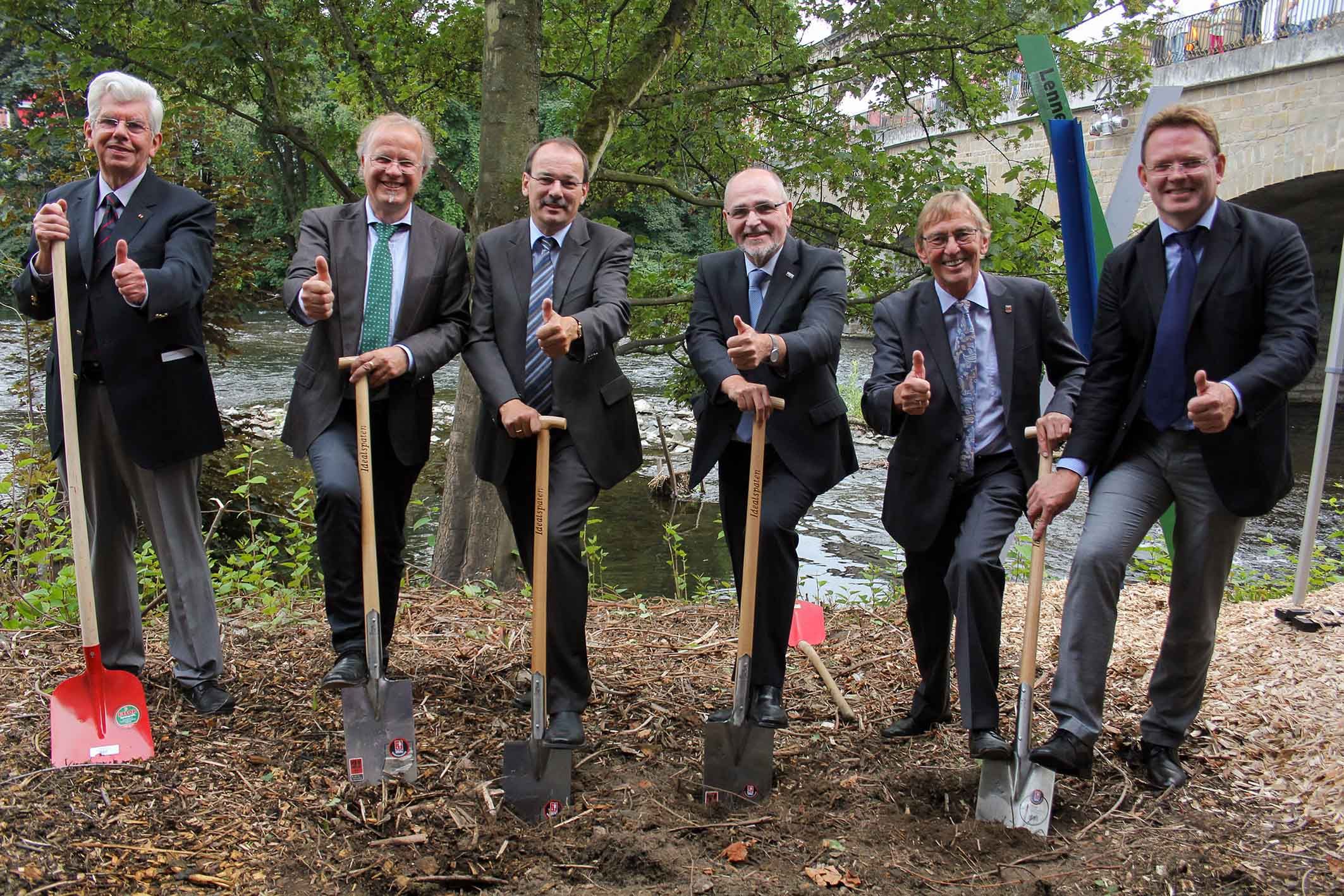 Daumen hoch für die Lennepromenade! Von links: Hohenlimburgs Bezirksbürgermeister Hermann-Josef Voß, Dirk Glaser, Geschäftsführer der Südwestfalen Agentur, Landrat Thomas Gemke, Regierungspräsident Dr. Gerd Bollermann, Iserlohns Bürgermeister Dr. Peter Paul Ahrens und der Bürgermeister von Altena, Dr. Andreas Hollstein.