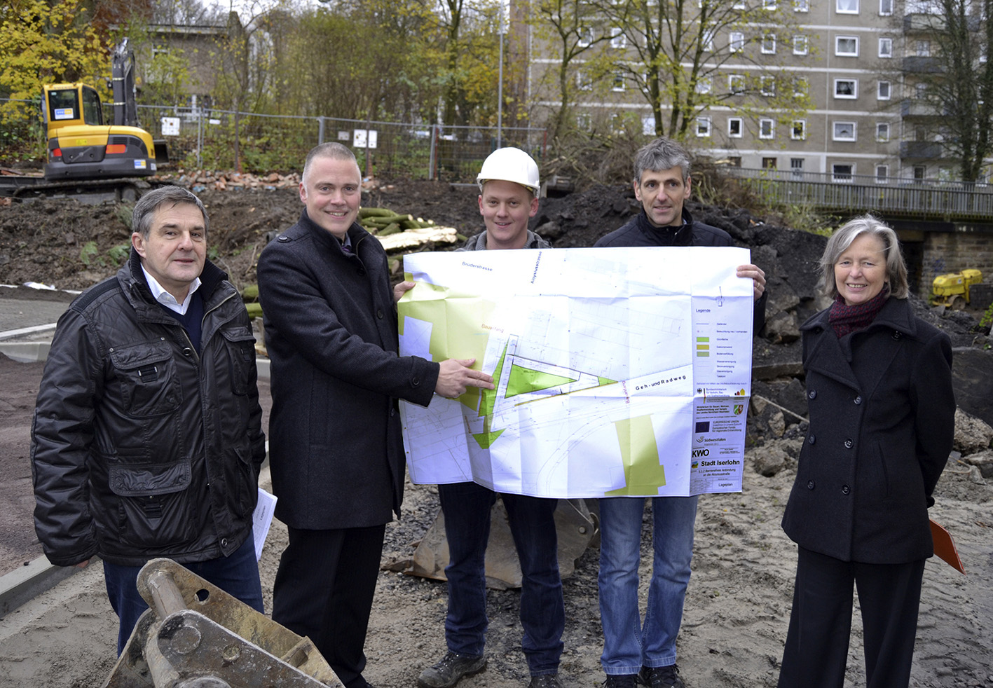 Stellten bei einem Pressetermin die Pläne für den Bau einer Rampe zur Anbindung der Aloysiusstraße an den Fuß- und Radweg auf der ehemaligen Bahntrasse vor (v.l.): Janusch Kieler vom Ingenieurbüro KWO, der Leiter des Ressort Planen, Bauen, Umwelt- und Klimaschutz Olaf Pestl, Sebastian Schmidt von der Firma Lahrmann sowie Stadtplaner Andreas Jaeckel und die Leiterin des Bereiches Stadtplanung Gabriele Bilke.