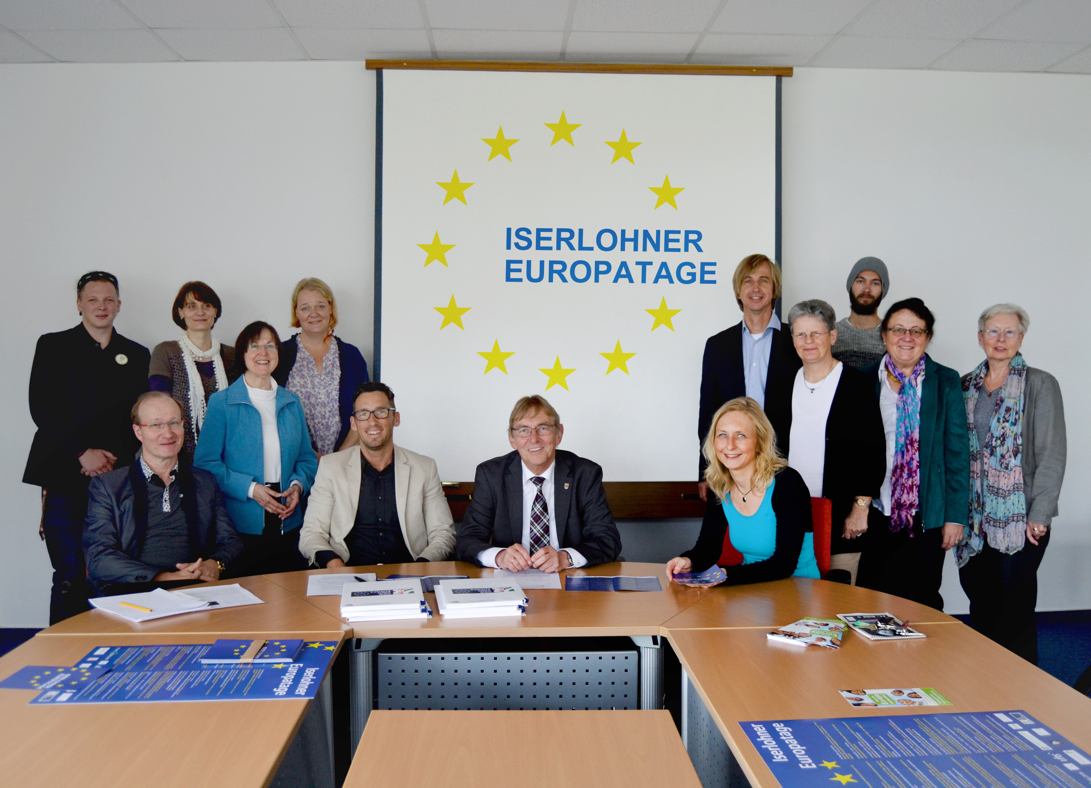 Bürgermeister Dr. Peter Paul Ahrens (M.) stellte bei einem Pressetermin im Iserlohner Rathaus gemeinsam mit seinen Mitarbeitern vom Büro für Europaangelegenheiten und Vertretern beteiligter Vereine und Einrichtungen das Programm für die Europatage 2014 vor.
