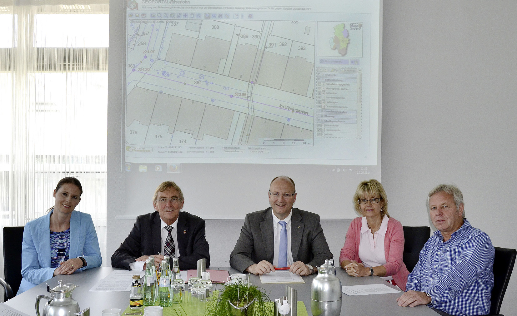 Iserlohns Bürgermeister Dr. Peter Paul Ahrens und Hemers Bürgermeister Michael Esken (2.u.3.v.l.) besiegelten bei einem Pressetermin im Iserlohner Rathaus die interkommunale Zusammenarbeit auf dem Gebiet des Geodatenmanagements mit einem Vertrag. Gemeinsam mit der Technischen Dezernentin der Stadt Hemer Andrea Wolf (2.v.r.) und der dortigen Planungsamtsleiterin Judith Feldner (l.) sowie dem Leiter der Iserlohner Abteilung für Grafische Informationssysteme Theodor Ostermann stellten sie die Inhalte der künftigen Zusammenarbeit vor.