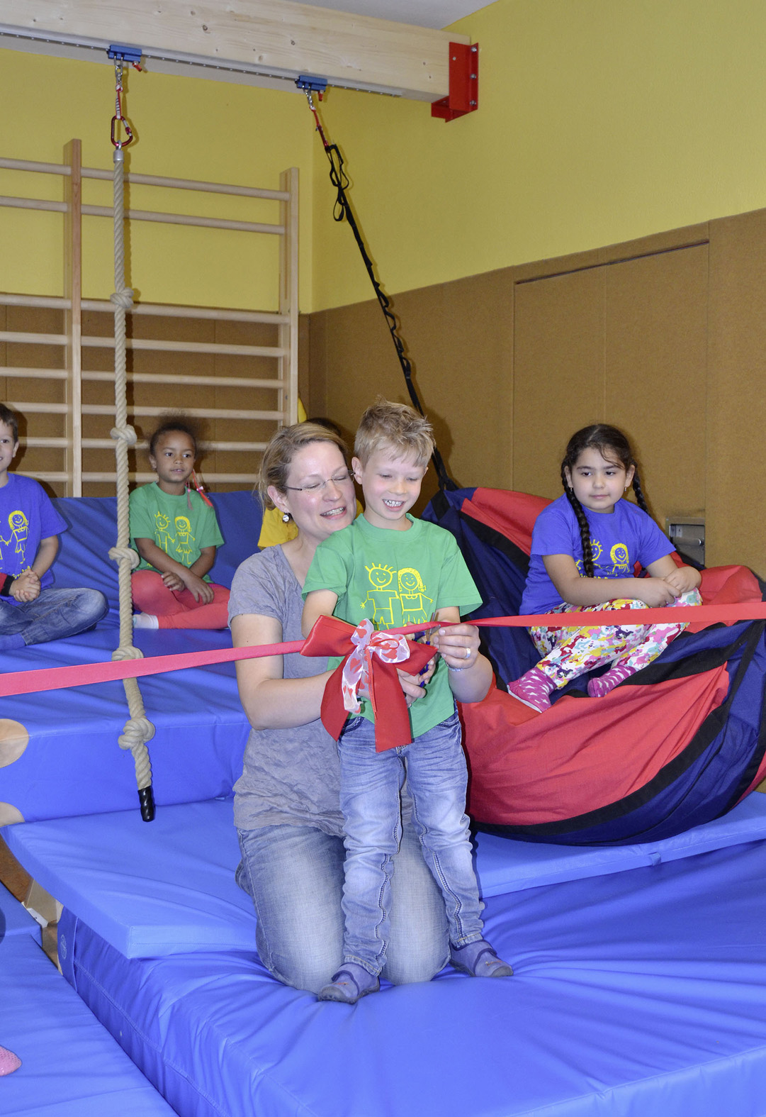 Joris durchschnitt im Namen der „Kleinen Strolche“ die symbolische Schleife bei der Übergabe der Schaukelanlage. Unterstützt wurde er dabei von seiner Mutter Tanja Schmack.