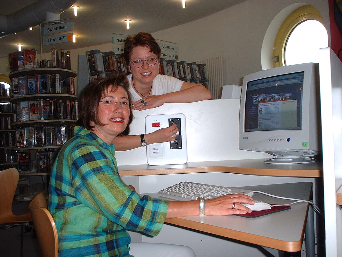 Bibliotheksleiterin Cornelia Berg und Eva Beck vor den neuen Computerterminals in der Stadtbibliothek