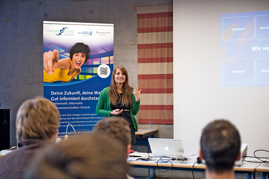Mit interaktiven Vorträgen begeistert "Coaching4Future" Jugendliche aus ganz Baden-Württemberg für Naturwissenschaften und Technik und unterstützt sie bei der Ausbildungs- und Studienwahl im MINT-Bereich. Die kostenlosen Infoveranstaltungen können unter www.coaching4future.de angefragt werden.