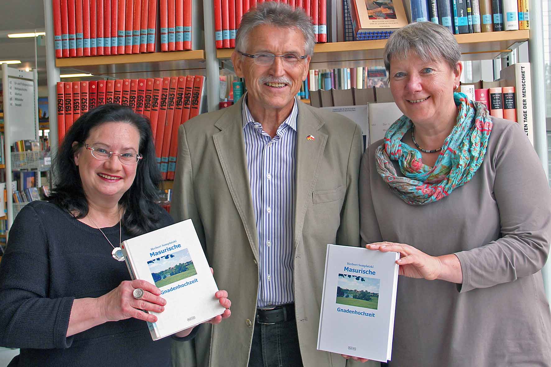 VHS-Mitarbeiterin Christina Zyprian (rechts) freut sich gemeinsam mit Stadtbibliotheksleiterin Marie-Luise Karle (links) und Karl Heinz Egger (Mitte, Partnerschaftsverein Szczytno) auf die Lesung von Herbert Somplatzki.