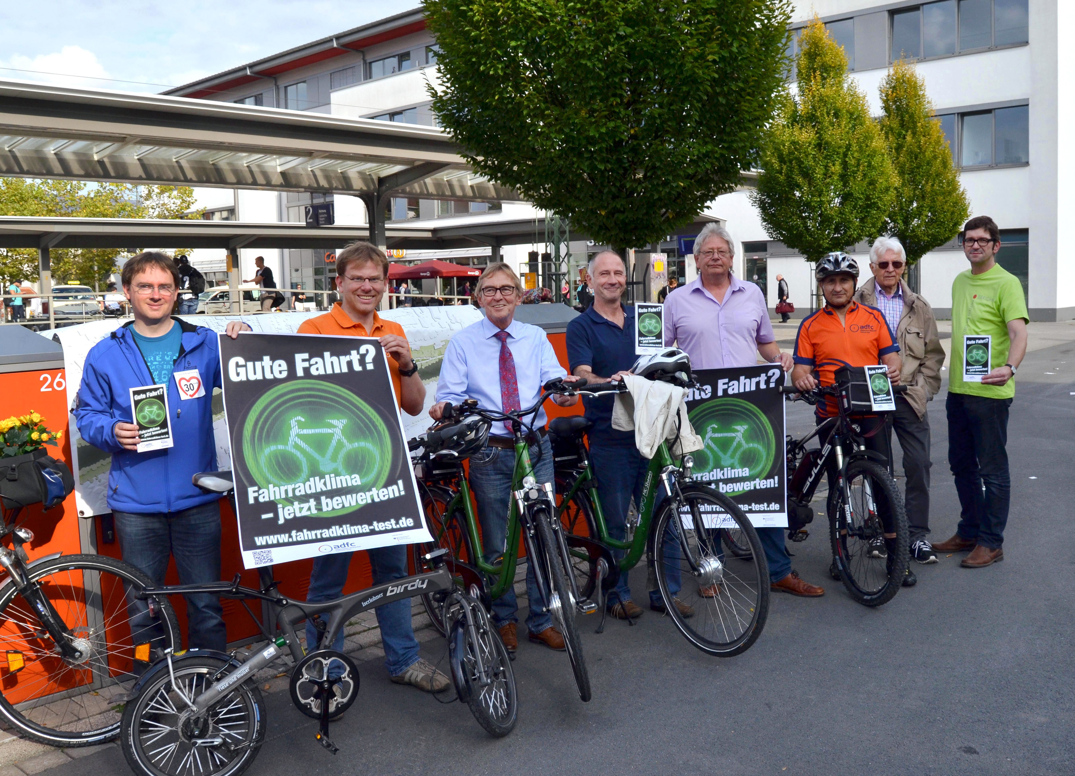 Rufen zur Teilnahme am Fahrradklimatest 2014 auf (v.l.) Markus Stumpf und Martin Isbruch (ADFC), Bürgermeister Dr. Peter Paul Ahrens, die städtischen Verkehrsplaner Michael Kuprat und Bernd Schlünder, Dieter Wileczelek und Werner Kroll (ADFC) und Stadtmarketingleiter Martin Bußkamp.