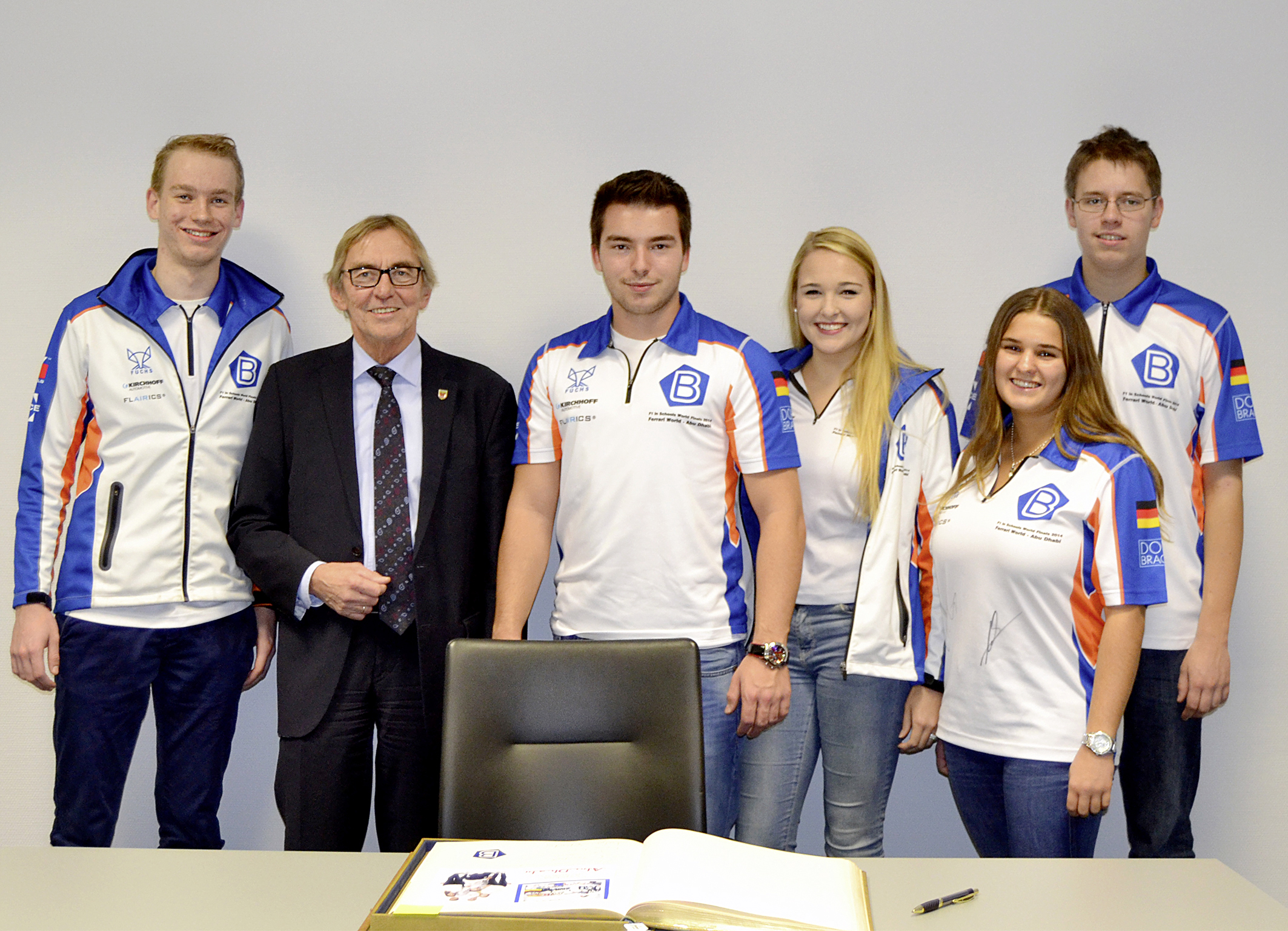 Bürgermeister Dr. Peter Paul Ahrens mit den F1 to School-Preisträgern (v.l.) Nick Neubert, Peter Zimmermann, Katja Schidor, Julia Pereira und Benedikt Roder.