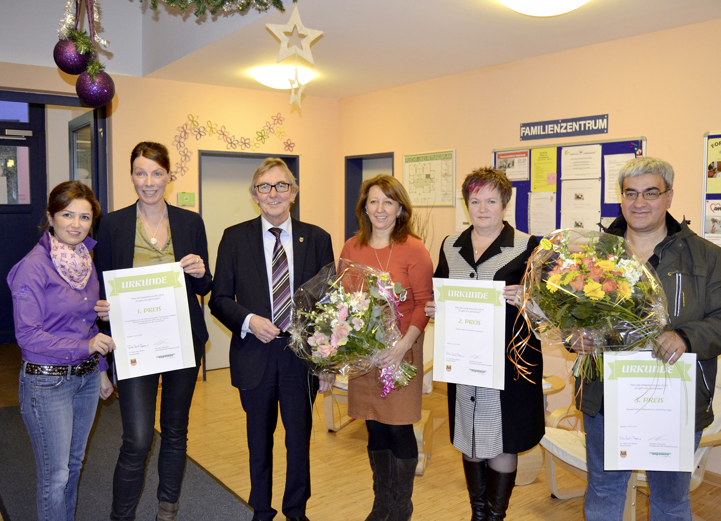 Bürgermeister Dr. Peter Paul Ahrens und die stellvertretende Vorisitzende des Integrationsrates Ludmila Esaulov (Mitte) mit den Vertretern der Preisträger (v.l.): Sema Yilmaz (Caritas) und Claudia Bals (AWO), Lidia Remisch (Gemeinschaft der Deutschen aus Russland) und Ramazan Demir.