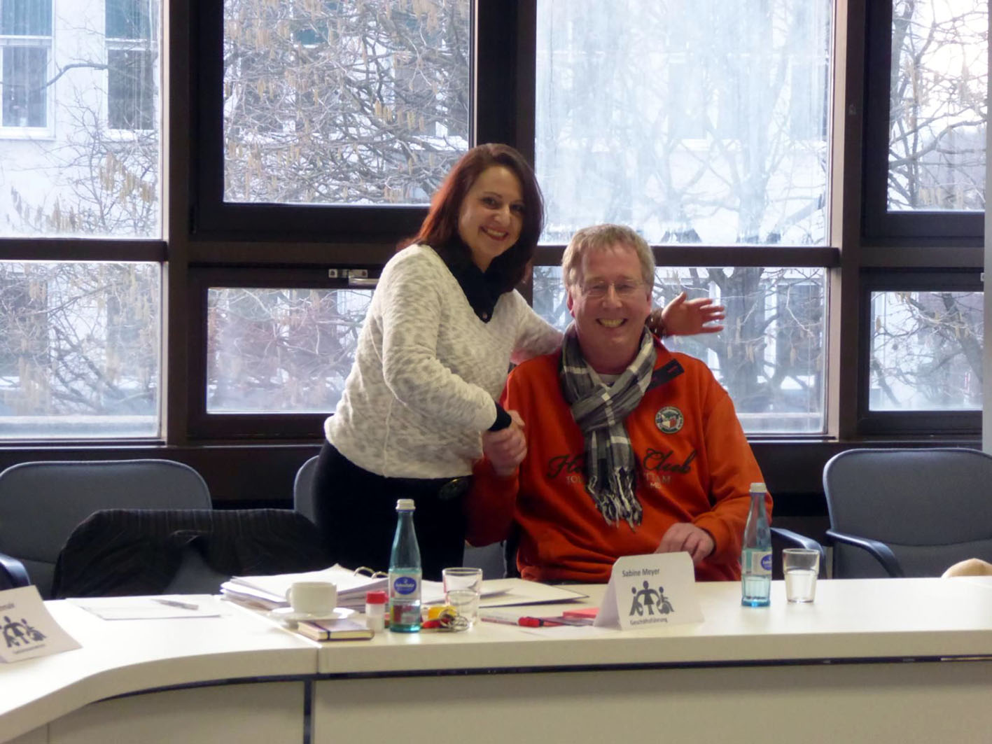 Die bisherige Vorsitzende Carina Steding-Rauch gratuliert dem neuen Beiratsvorsitzenden zu dessen Wahl.