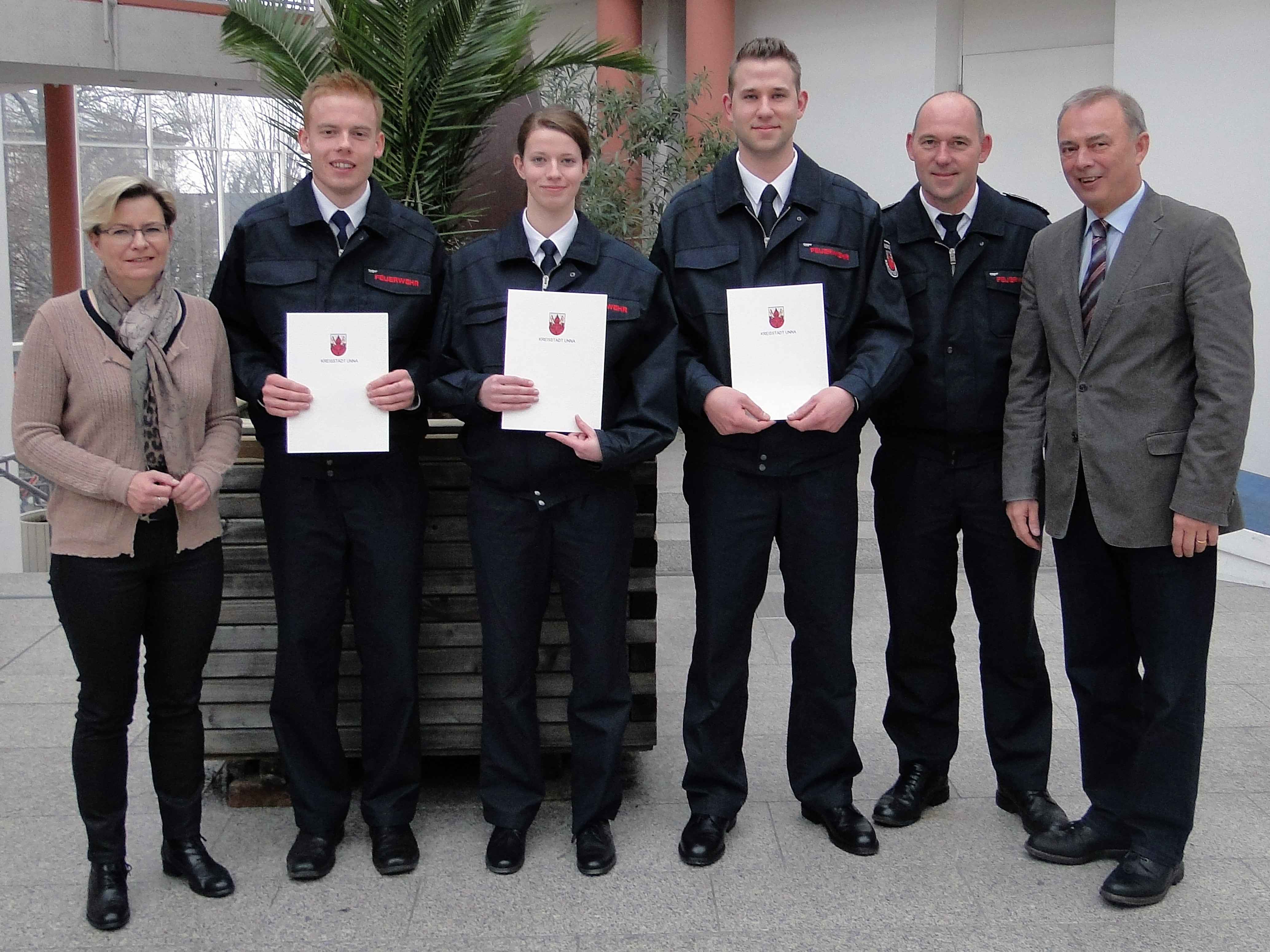 von links: Personalratsvorsitzende Annette Schmidt, Daniel Lochmann, Maren Frohnert, Dominik Heinze, Der Leiter der Feuer- und Rettungswache Olaf Weischenberg, Bürgermeister Werner Kolter