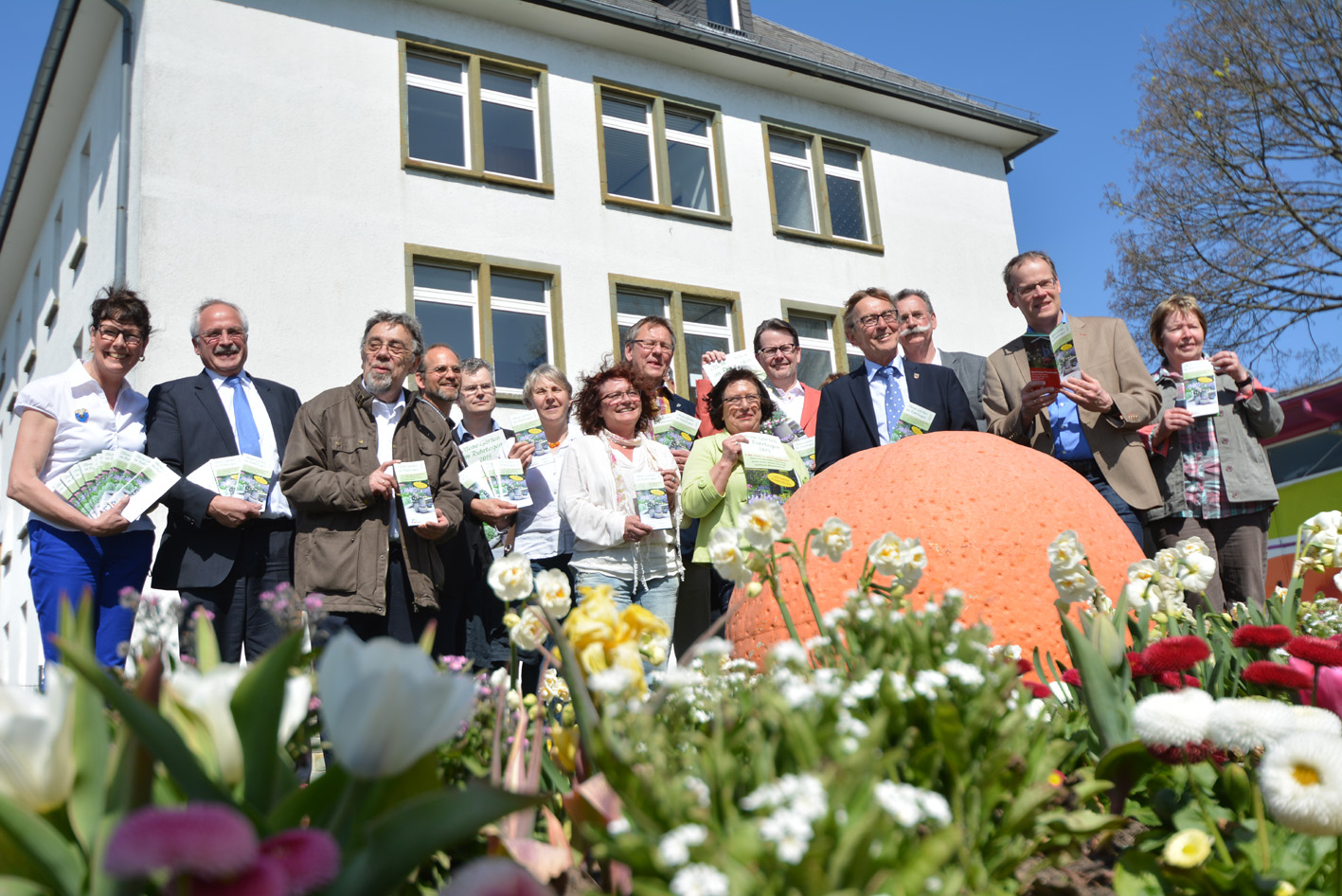 Bürgermeister der beteiligten Städte sowie Mitglieder der Projektgruppe stellten am Mittwoch, 15. April, im Sauerlandpark inHemer die Broschüre „Offene Gärten im Ruhrbogen 2015“ vor.