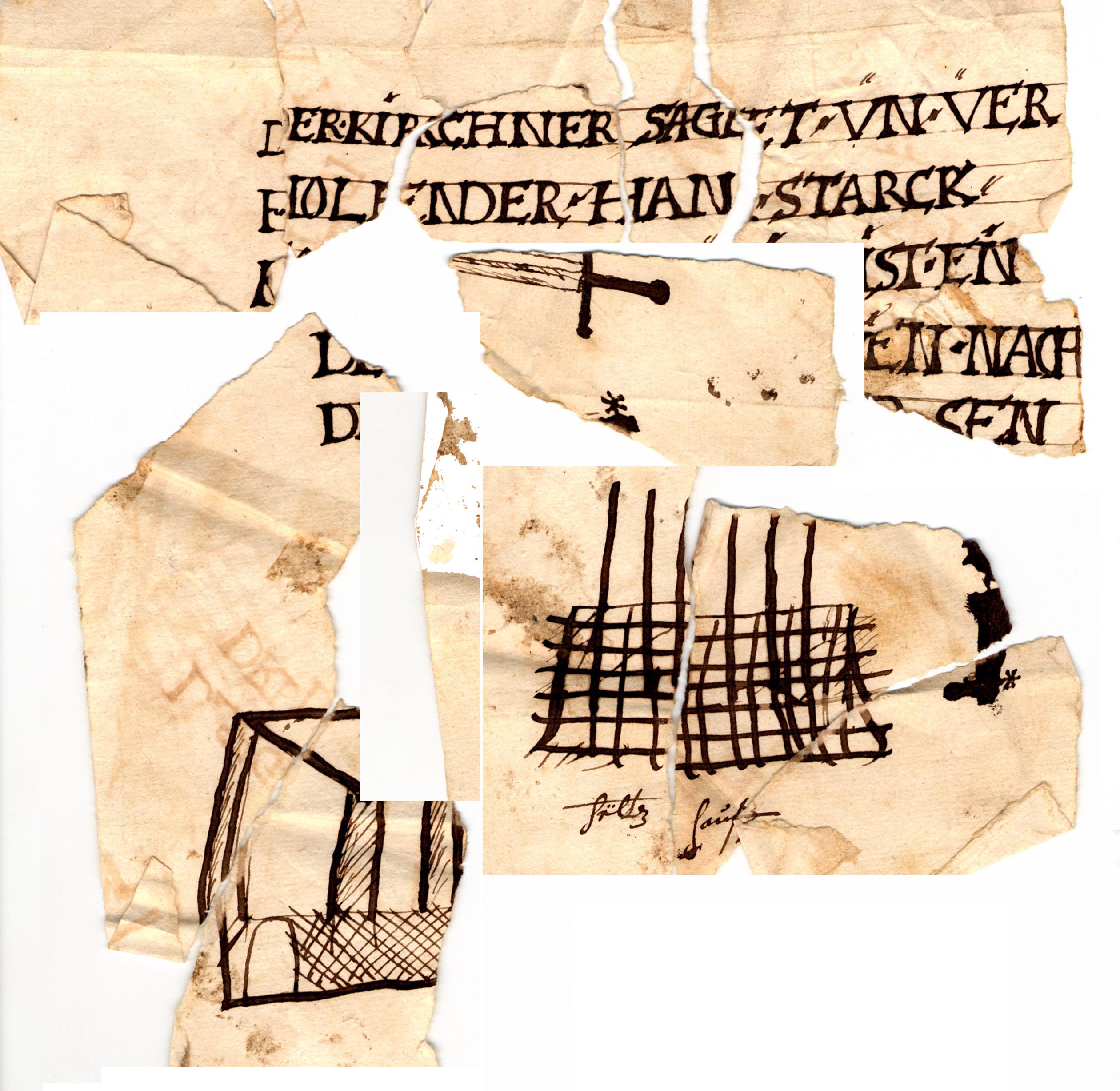 Bild: Scheiterhaufen, Galgen, Richtschwert: ein „Hexenzettel“ aus Wertheim. Vorlage: Archivverbund Main-Tauber